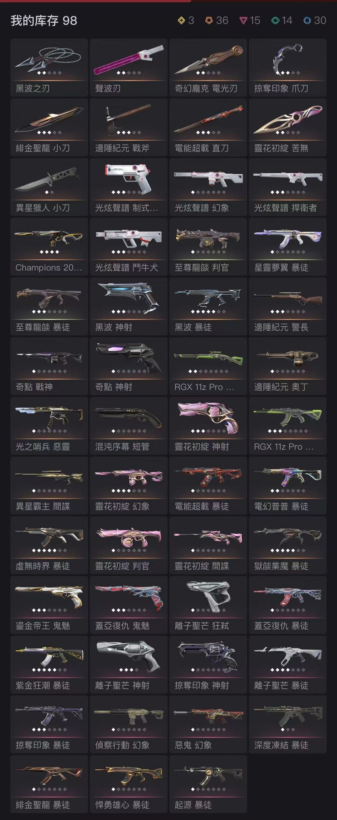 超凡,刀皮数量12,枪皮数量98(绝版1,限定36,究极3,尊爵15)