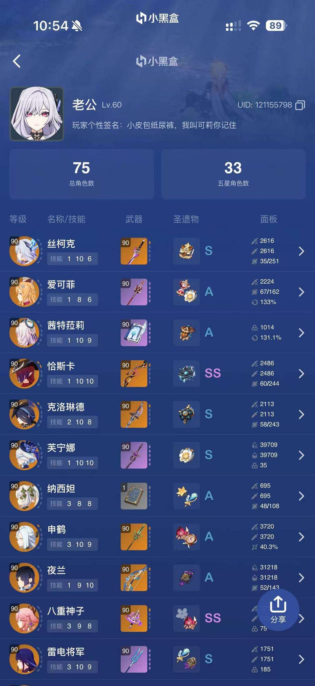 62金丝柯克爱可菲茜特菈莉恰斯卡克洛林德芙宁娜纳西妲申鹤夜兰八重神子