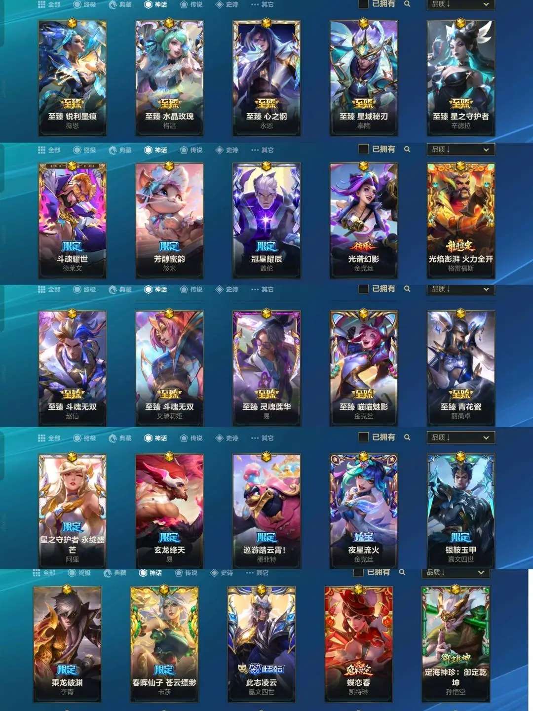 顶极 ,786皮肤,彩名,马年限定,克斯终焉,永恩寻道世尊 ,橙名,8臻藏,60多神话 ,