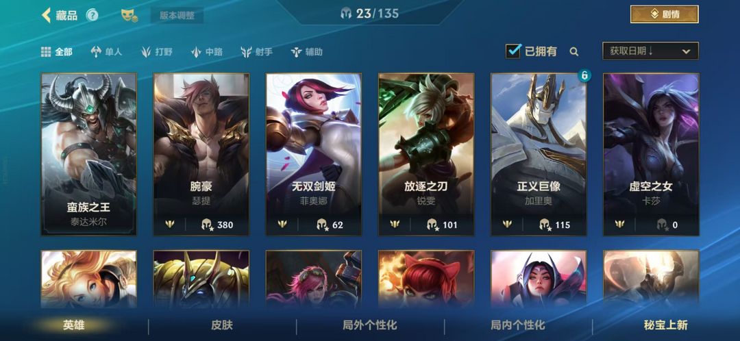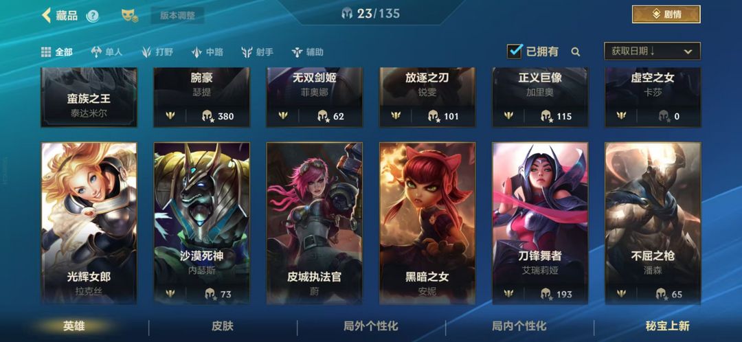 限制: 撤单率<50%才可租用此帐号装备描述:23英雄2皮肤、西部牛仔、王牌舰长、盲僧、影流之镰、铸星龙王、疾风剑豪、暗裔剑魔、寒冰射手、暴走萝莉、德玛西亚之力、九尾妖狐、无极剑圣、星籁歌姬、蛮族之王、无双剑姬、放逐之刃、正义巨像、虚空之女、光辉女郎、沙漠死神、皮城执法官、黑暗之女