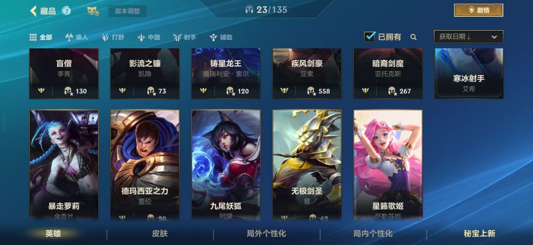 23英雄2皮肤、西部牛仔、王牌舰长、盲僧、影流之镰、铸星龙王、疾风剑豪、暗裔剑魔、寒冰射手、暴走萝莉