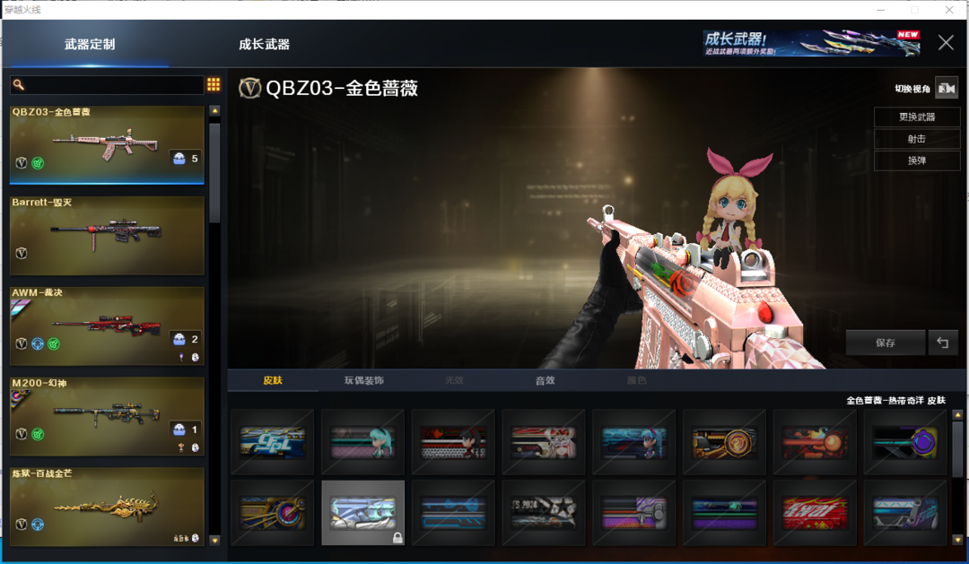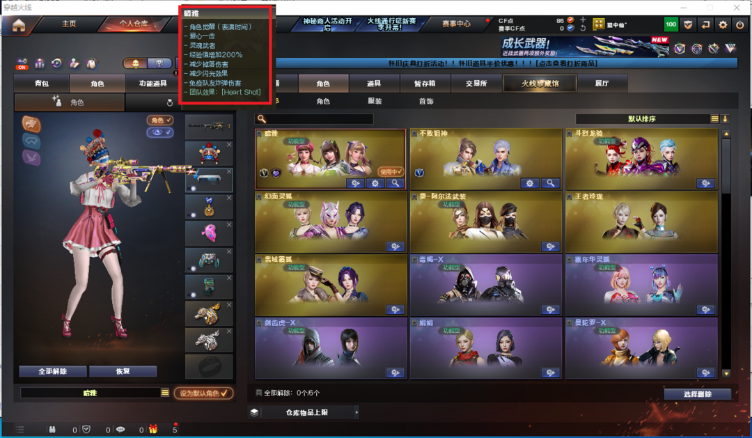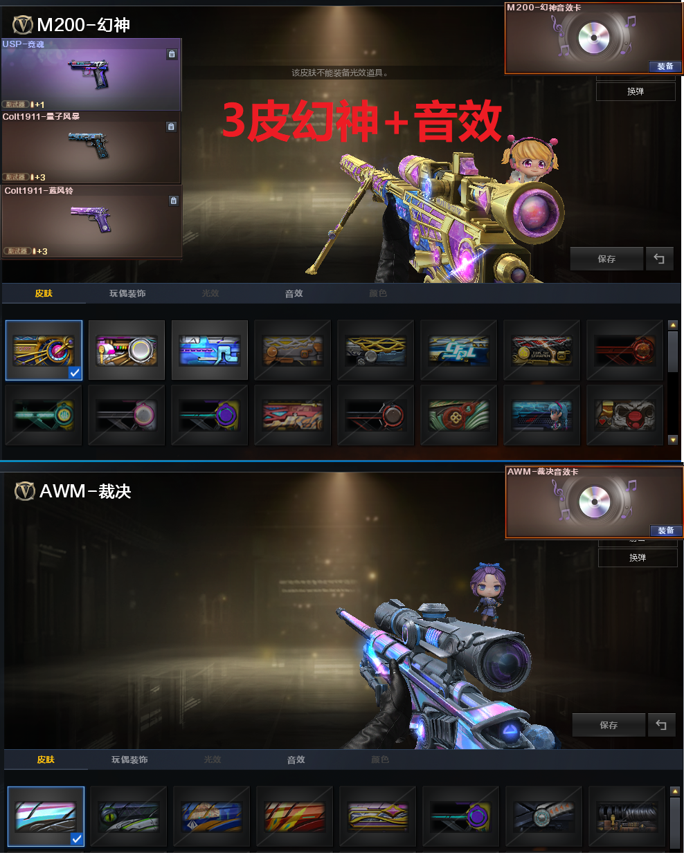 装备描述:排位:可以.--------------爆破全装:幻神3皮+音效(幻神-Heartshot皮肤、电竞之星、动感闪耀皮肤)、USP手枪、柯尔特手枪、QBZ金色蔷薇、炽芒蝶刃、、、幻神音效、裁决音效、、、1套雷霆、1套竞技荣光、、、爆破人物(晴雅)