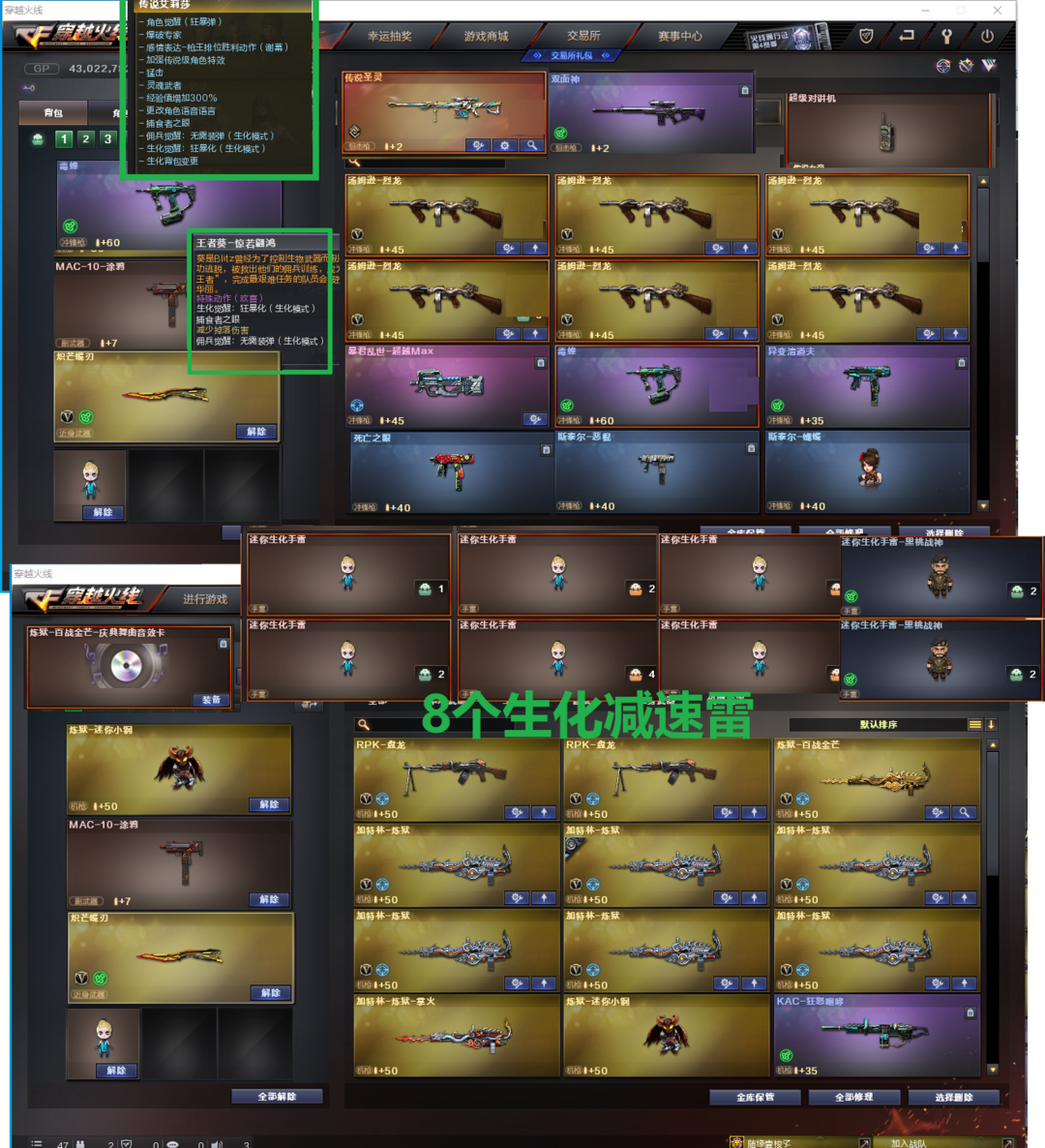 装备描述:排位:可以--------------生化四防极品(生化背包更换、可以看僵尸血量):无需换弹、6烈、2盘、6炼狱、炼狱小钢、KAC狂怒咆哮、双面神、传说圣灵、毒蜂、斯太尔蝴蝶、异变清道夫、死亡之眼、MAC涂鸦、炽芒蝶刃、手斧镜、6个生化减速雷、超级对讲机、、、、、、、爆破四防:幻神3皮+音效(23白鲨世冠、AG冠军、宠儿皮肤)、98K星神、M200-竞技荣光、、USP冥王、USP雷暴、柯尔特-百战金芒、23白鲨世冠柯尔特、柯尔特竞技荣光、COP堕天神、COP幻灵、、、传说圣灵、传说夜影、传说光耀、传说暗裔、QBZ冠军之薇、G36C幻影、QBZ天罚、白虎、白虎之魄、、、幻神音效、星神音效、雷神音效、毁灭音效、黑骑士音效、、、7套雷暴、5套雷暴、6堕天神、7套幻灵、7套竞技荣光、、、、、爆破四防(传说女帝、云悠悠、王者貂蝉、影豹、雨棠、职业经理)、生化四防(传说艾丽莎、王者惊若翩鸿、职业选手)