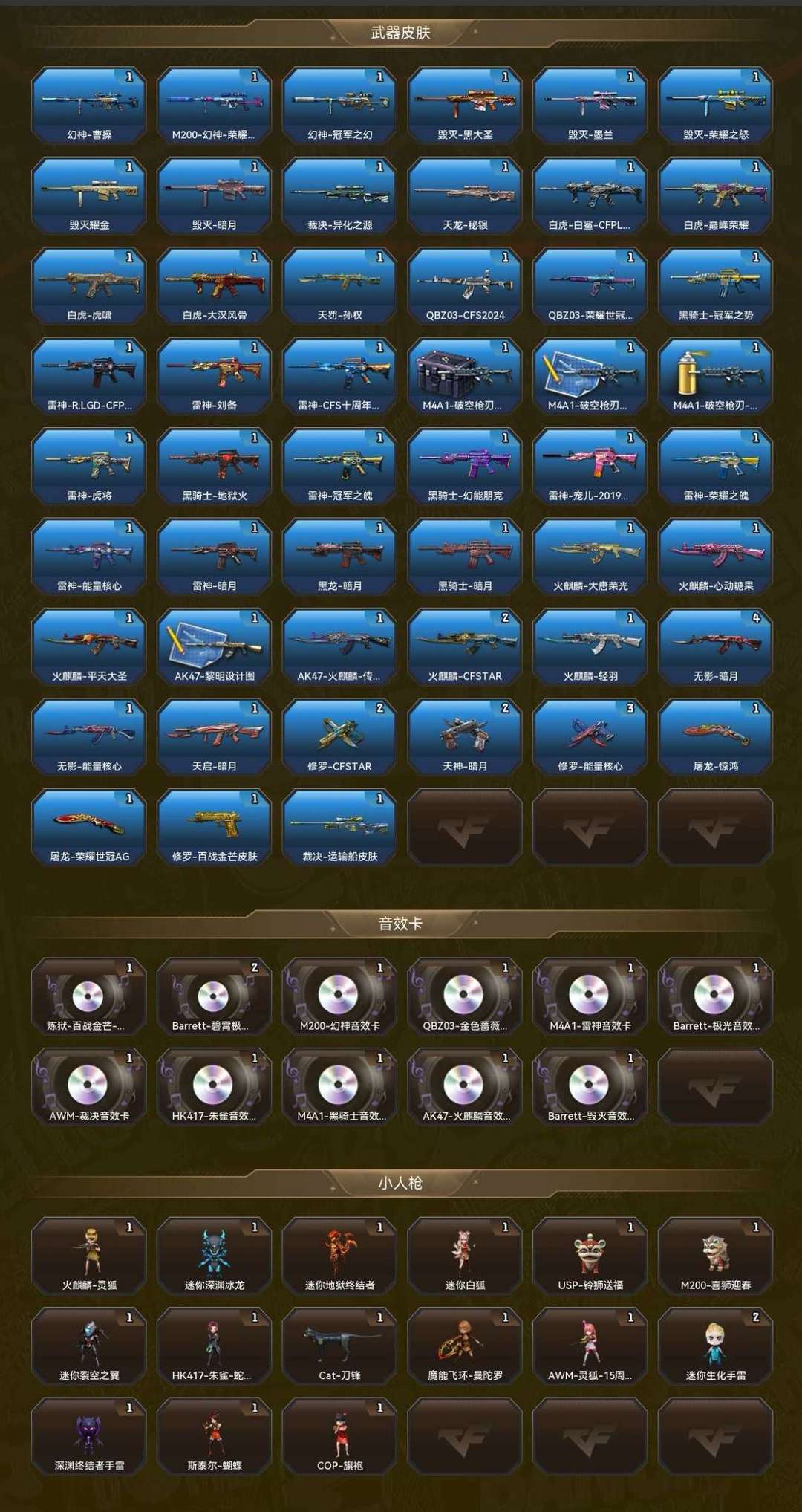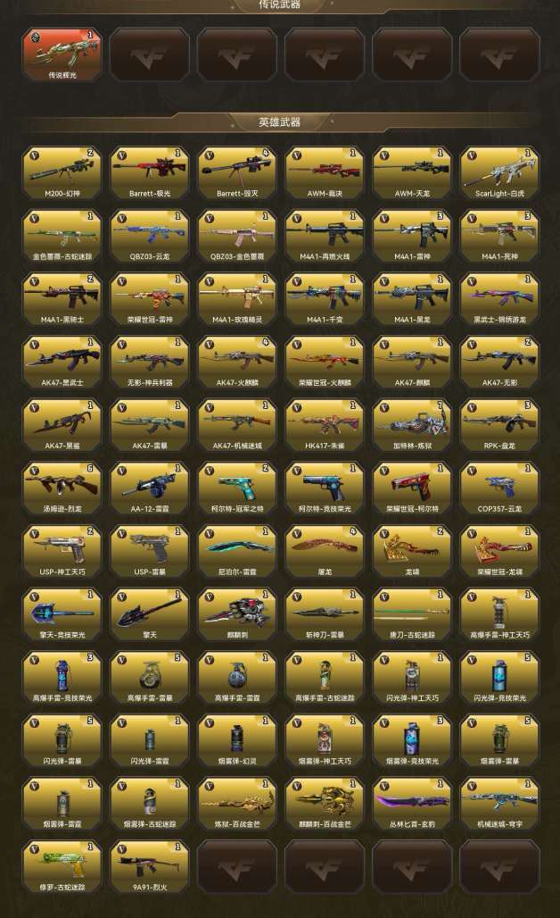 装备描述:本游戏账号:英雄武器117个; 王者武器20个。 装备齐全拥有完美游戏体验。重要的是,特殊装备有:USP雷暴王者+斩神刀王者USP灵狮祝福M200喜狮迎春、M4A1-黑骑士、M4A1-玫瑰精灵、AK47-黑武士、麒麟刺、AK47-火麒麟、AK47-麒麟、AWM-天龙、Barrett-毁灭、加特林-炼狱、M4A1-雷神、M4A1-黑龙、QBZ03-金色蔷薇、AA-12-雷霆、AK47-雷暴、HK417-朱雀、Scar Light-白虎、M200-幻神、USP-雷暴、荣耀世冠-柯尔特、荣耀世冠-火麒麟、荣耀世冠-雷神、荣耀世冠-龙啸、雷霆之锋、传说辉光、擎天-竞技荣光、柯尔特-竞技荣光、烟雾弹-竞技荣光、闪光弹-竞技荣光、高爆手雷-竞技荣光、USP-神工天巧、高爆手雷-神工天巧、闪光弹-神工天巧、烟雾弹-神工天巧、火麒麟-暗月、火麒麟-灵狐、炫金火麒麟、炫金黑龙、炫金毁灭、炫金天神、高爆手雷-雷霆王者、Barrett-雷霆王者-觉醒版、M4A1-雷霆王者-觉醒版、王者之怒-觉醒版、王者之锋-觉醒版、王者之魄-觉醒版、王者霜心、雷霆王者之锋-觉醒版、王者雷影、黑武士