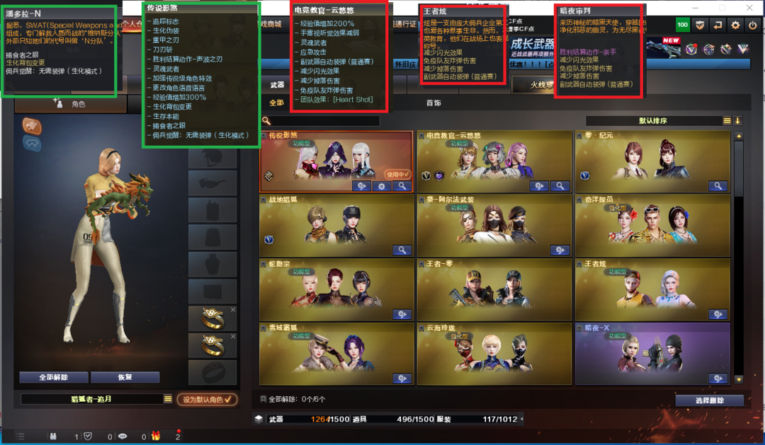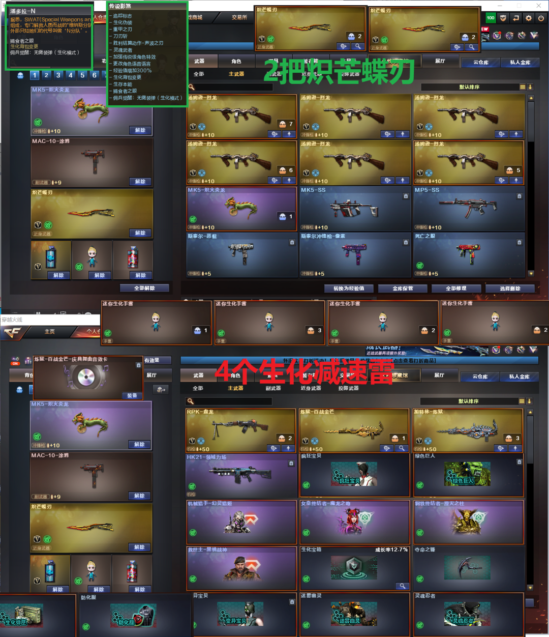 装备描述:排位:可以----------生化四防:(背包变更、可以查看生化僵尸血量):无需换弹、6烈龙、盘龙、2炼狱+音效、MK5-炽火炎龙、HK21-领域力场、死亡之眼、MAC-涂鸦、2把炽芒蝶刃、4个生化减速雷、超级对讲机、全部弹匣、、、、、、、爆破四防:幻神音效(24AG冠军皮肤)、M200-竞技荣光、2个柯尔特竞技荣光、COP云龙、COP雷霆王者、冠军之特、FAMAS G2-天戎、G36幻影、白虎、QBZ云龙、王者玄武、、、幻神音效、裁决音效、雷神音效、毁灭音效、炼狱音效、黑骑士音效、、、3套竞技荣光、4套云龙、5套雷霆王者、、、生化四防(传说影煞、潘多拉-N)爆破四防(云悠悠、王者炫、暗夜审判)