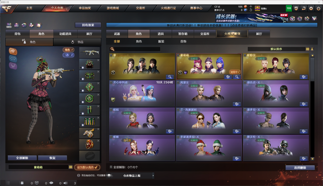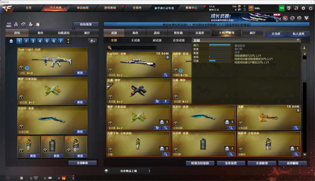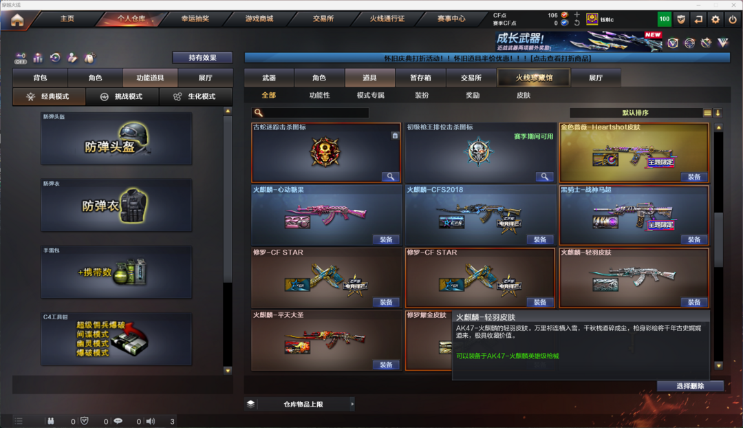 装备描述:王者武器:炫金骑士;炫金雷神 英雄武器:龙啸;Kar98K-星神;M14EBR-玄武;雷霆之锋;闪光弹-雷霆;M4A1-雷神;QBZ03-金色蔷薇;无影-神兵利器;AK47-火麒麟;沙鹰-修罗;Scar Light-白虎;沙鹰-天神;AWM-天龙;Barrett-毁灭;9A91-烈火;M4A1-黑骑士;汤姆逊-烈龙 角色:零;雾萌萌;猎狐者;飞虎队;幻影;灵狐者;兰-海滩派对;娟娟;剑齿虎-X;圣诞潘多拉-X;风暴女;芳心审判者;金戈;铁骑 道具:步枪弹匣;闪光护目镜;变异宝贝;幽灵之刃;生化弹匣;烟雾保护头盔;绿色巨人;妖姬;手雷包;C4工具钳;绿色巨人;灵魂忍者;迷雾幽灵;疯狂宝贝;防化服;防弹衣;防弹头盔;防化服;变异宝贝;超级背包;特殊水壶-海滩派对;魔法帽子;猫耳头盔;夺命之镰;防化服;防弹头盔;C4工具钳;手雷包;防弹衣;防弹头盔。