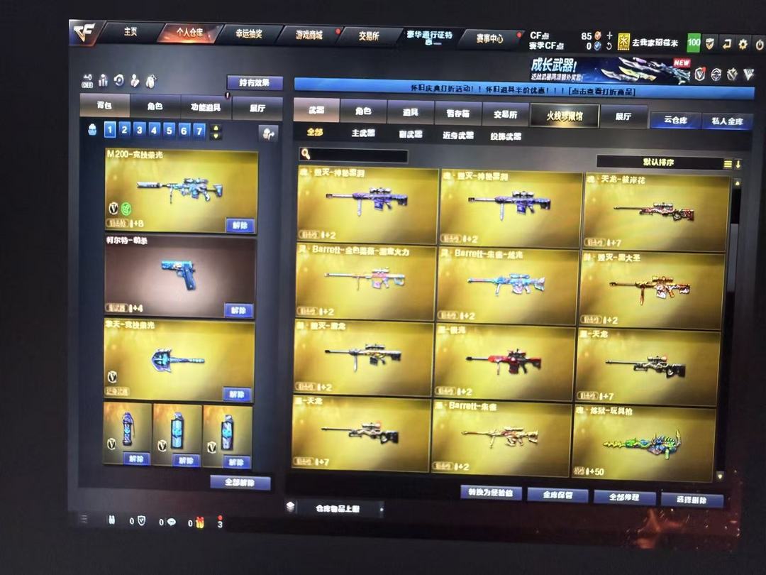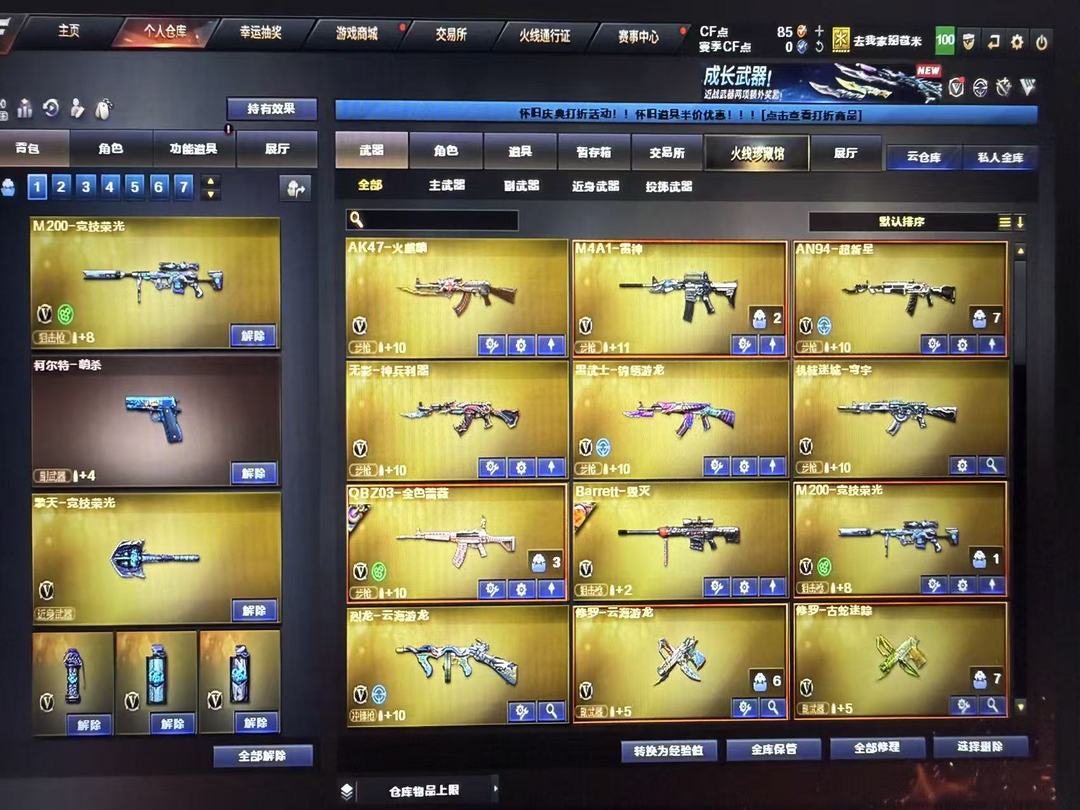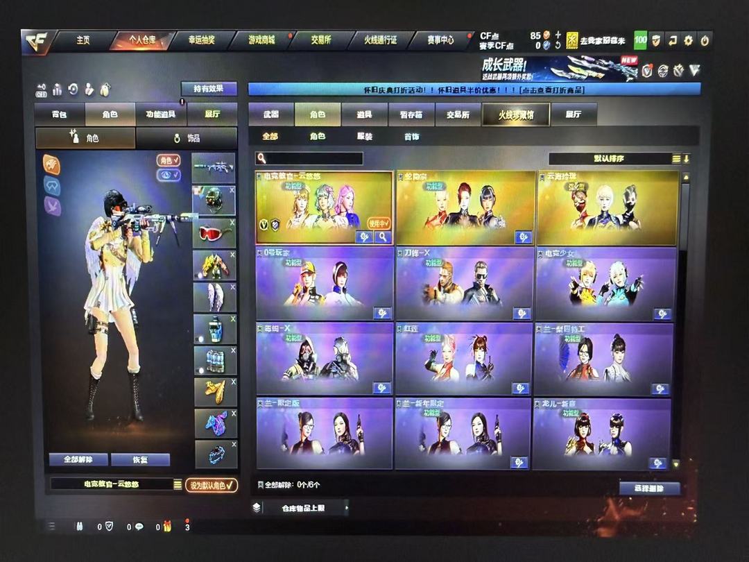 装备描述:机械迷城-穹宇;M200-竞技荣光;擎天-竞技荣光;M4A1-雷神;AK47-火麒麟;QBZ03-金色蔷薇;Barrett-毁灭;高爆手雷-竞技荣光;烟雾弹-竞技荣光;闪光弹-竞技荣光;黑武士-锦绣游龙;烈龙-云海游龙;擎天-云海游龙;手雷-云海游龙;AN94-超新星;修罗-云海游龙;无影-神兵利器 角色:电竞教官-云悠悠;猎狐者;刀锋;幻影;堕天使;精英部队;妲己;夜玫瑰-X;新曼陀罗;圣诞潘多拉-X;代号:翼;兰-梨园特工;毒蝎-X;木兰;维纳斯;电竞少女;娜塔莉娅;红莲;兰-限定版;游珑儿;夜玫瑰-宠粉;0号玩家;智影
