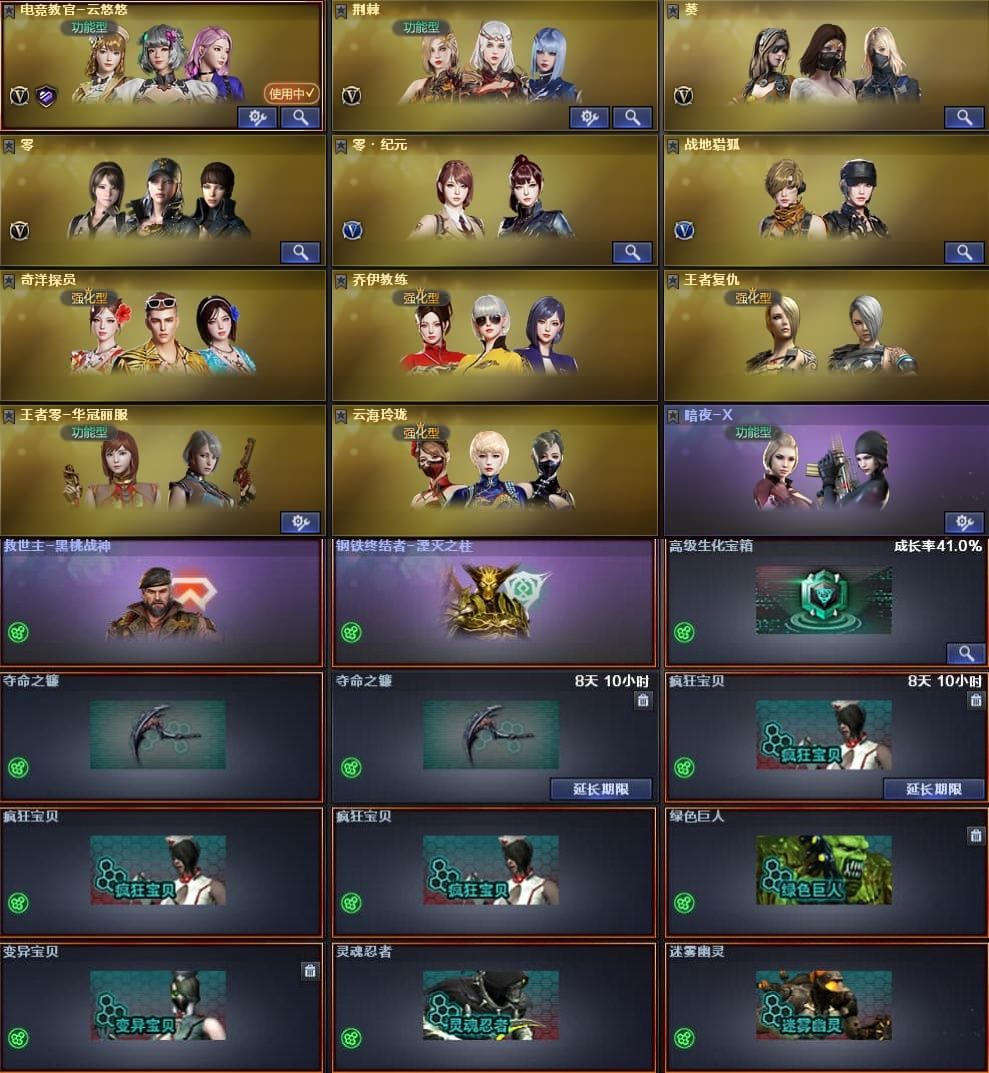 ✅优质爆破生化✅传说暗裔✅王者星神✅雷霆王者竞技荣光套✅毁灭火麒麟三件套✅6烈✅云悠悠荆棘四防