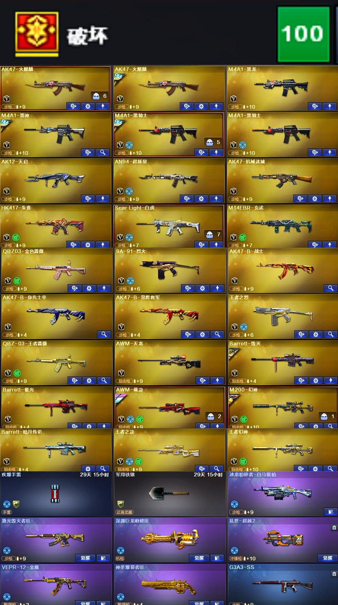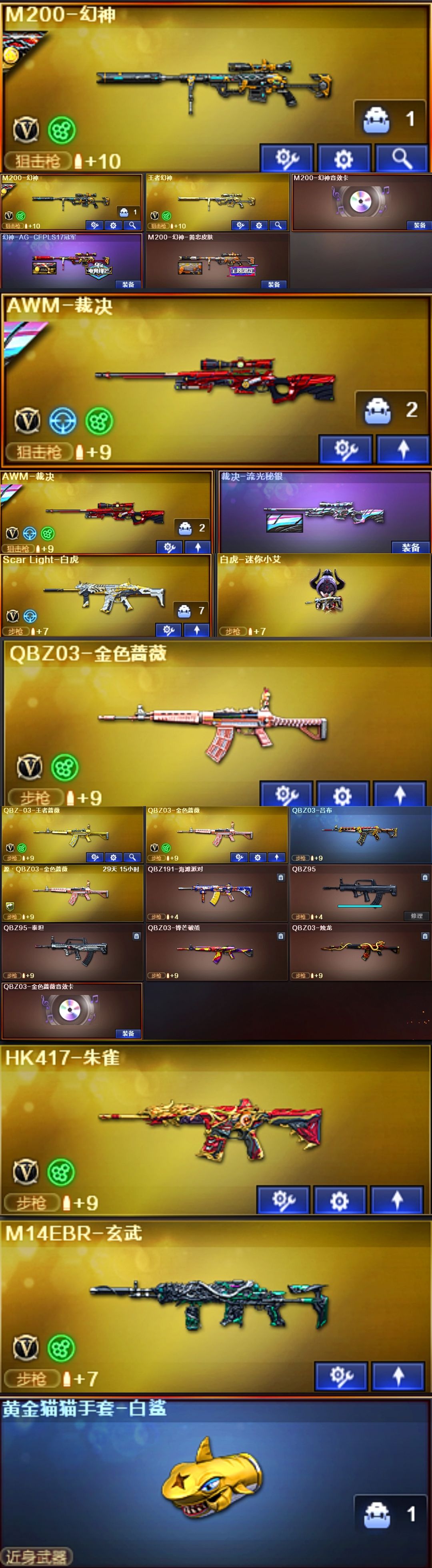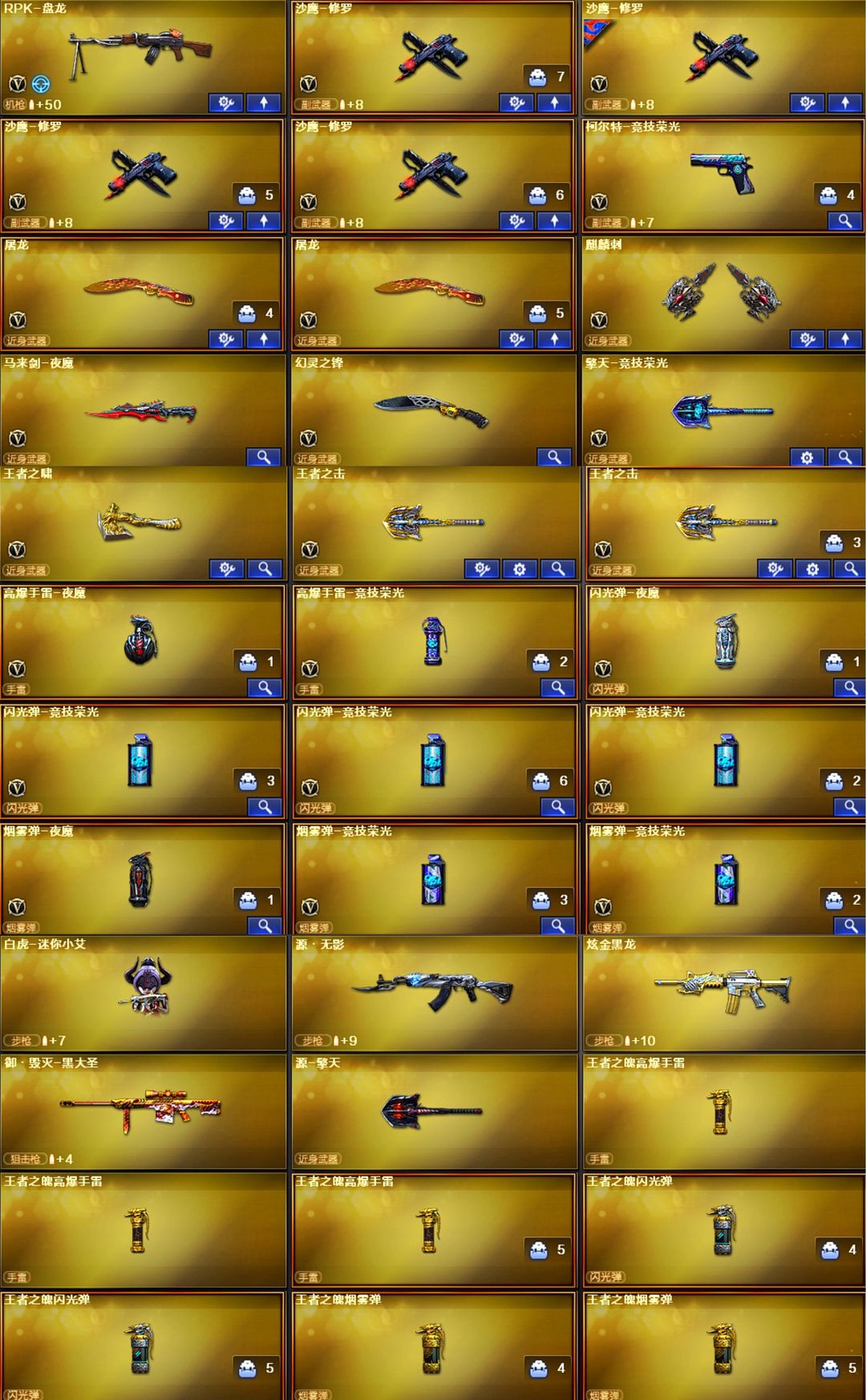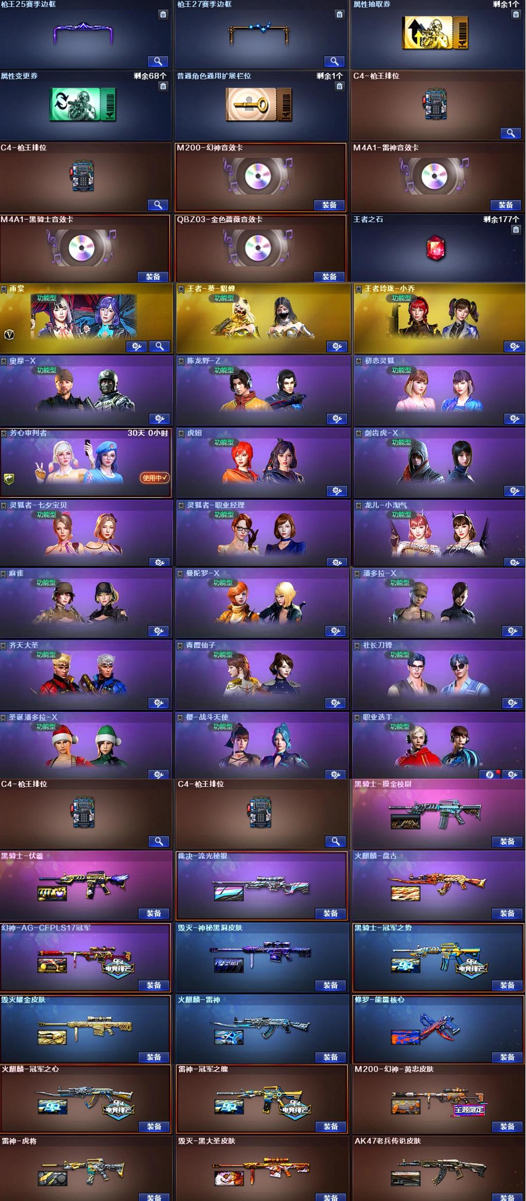 装备描述:王者武器:王者之魄高爆手雷;王者之魄闪光弹;王者之魄烟雾弹;王者之决-觉醒版;王者之烈-觉醒版;炫金黑龙;王者幻神-觉醒版;QBZ-03-王者蔷薇-觉醒版;王者之击-觉醒版;王者之啸-觉醒版 英雄武器:HK417-朱雀;QBZ03-金色蔷薇;AN94-超新星;M4A1-黑骑士;M14EBR-玄武;Scar Light-白虎;闪光弹-竞技荣光;烟雾弹-竞技荣光;高爆手雷-竞技荣光;擎天-竞技荣光;柯尔特-竞技荣光;马来剑-夜魔;烟雾弹-夜魔;高爆手雷-夜魔;闪光弹-夜魔;AK47-机械迷城;AK12-天启;AK47-火麒麟;9A91-烈火;麒麟刺;AWM-天龙;Barrett-极光;M4A1-黑龙;AWM-裁决;RPK-盘龙;屠龙;幻灵之锋;Barrett-毁灭;沙鹰-修罗;Barrett-暗月传说;M4A1-雷神;AK47-B-常胜将军;AK47-B-战士;AK47-B-身先士卒;M200-幻神 角色:雨棠;潘多拉;幻影;复仇者;精英部队;王者-葵-貂蝉;陈龙野-Z;青霞仙子;职业选手;灵狐者-职业经理;奥摩-X;王者玲珑-小乔;麻雀;剑齿虎-X;圣诞潘多拉-X;虎妞;社长刀锋;芳心审
