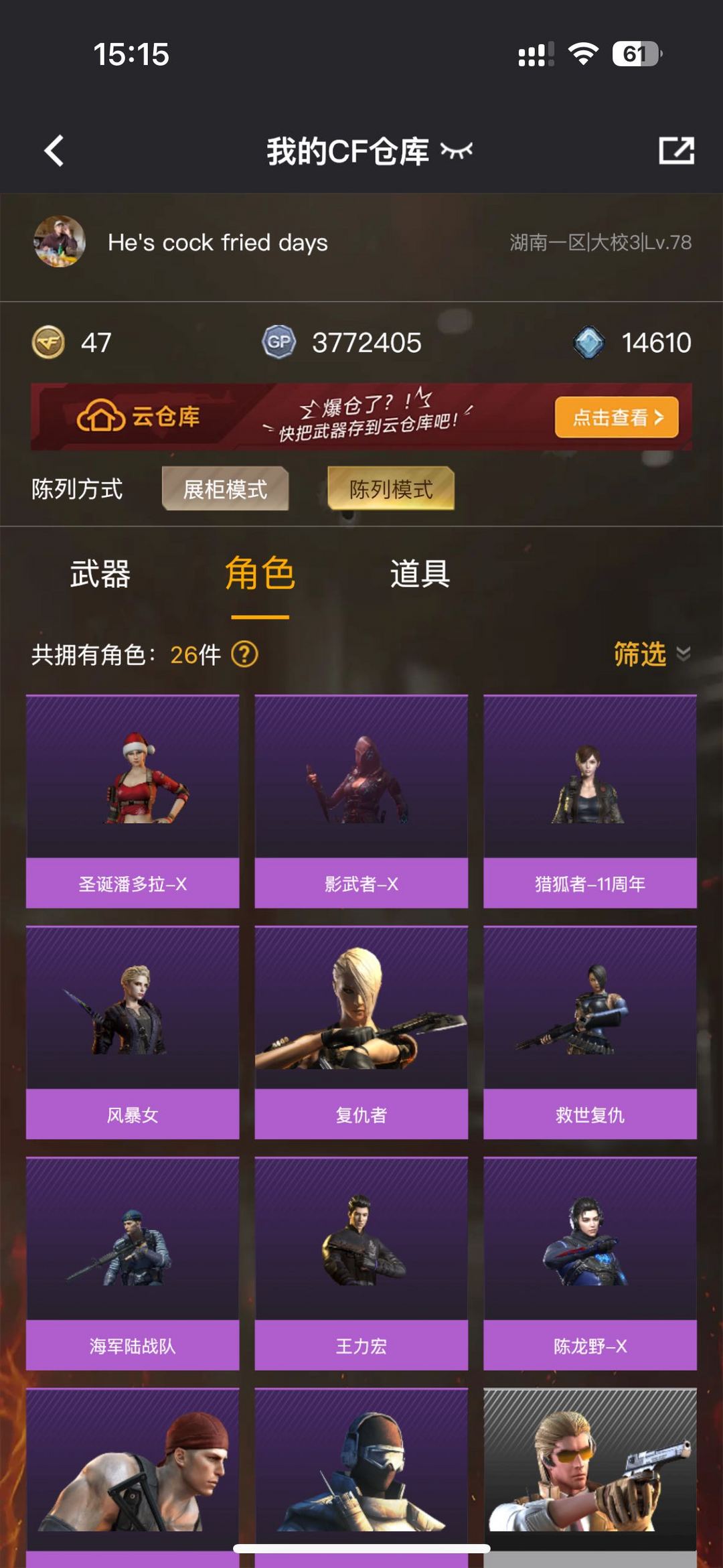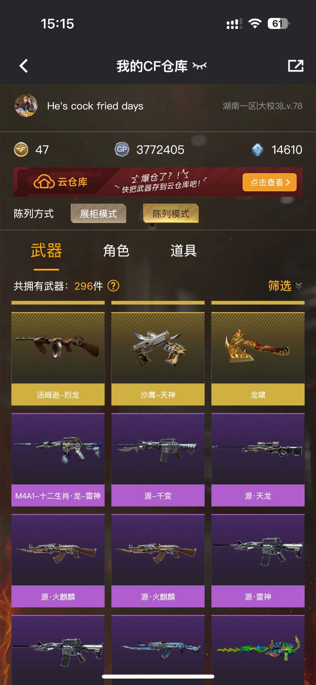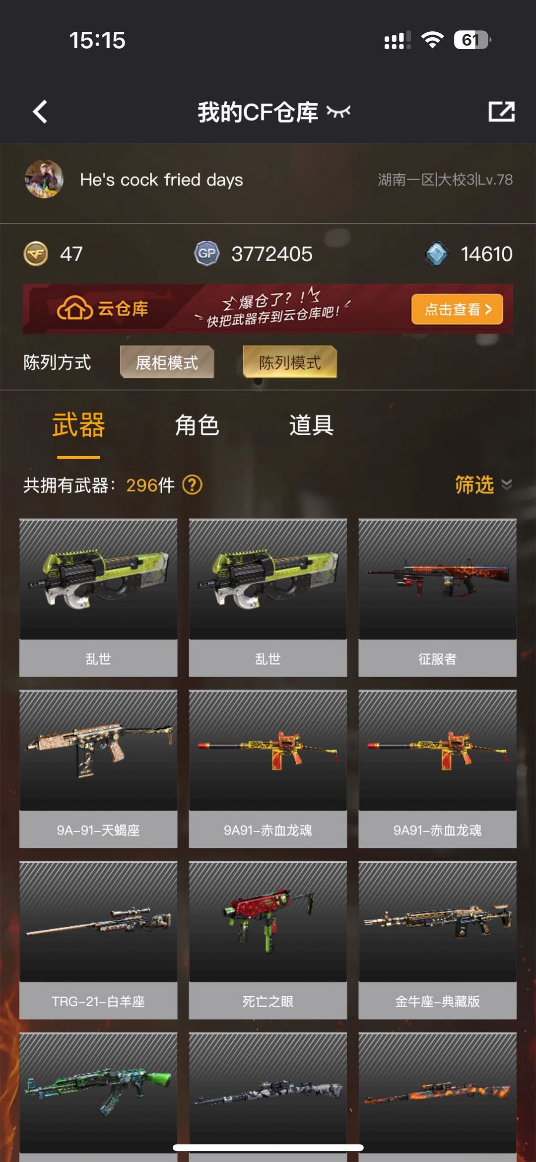 装备描述:这个账号是我从小学玩到大学的 以前没钱充值都是攒了好久的钱才去充值的 唉 以前想天天都玩cf 现在长大了却没时间玩了 好久没玩了 兄弟们帮我玩吧