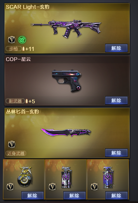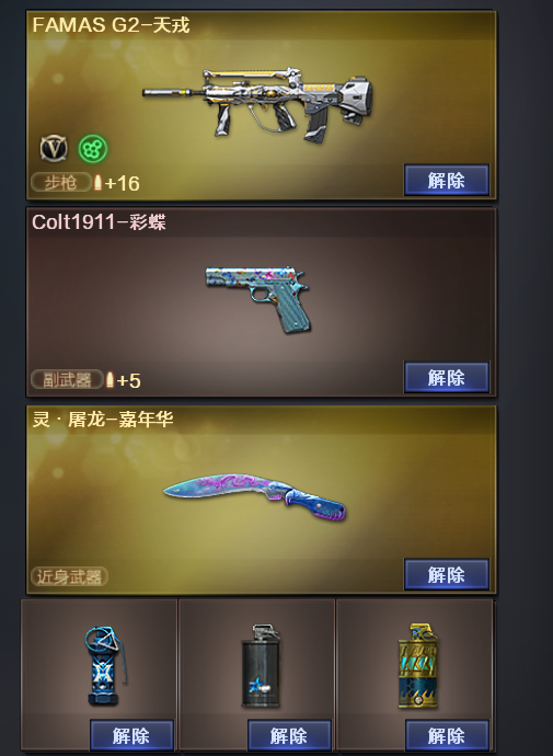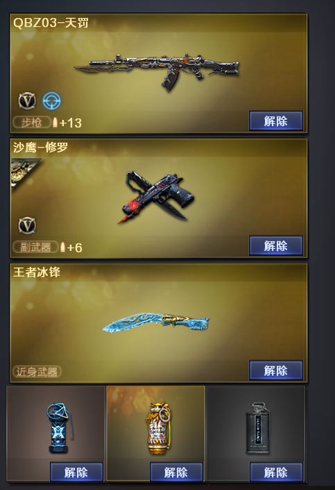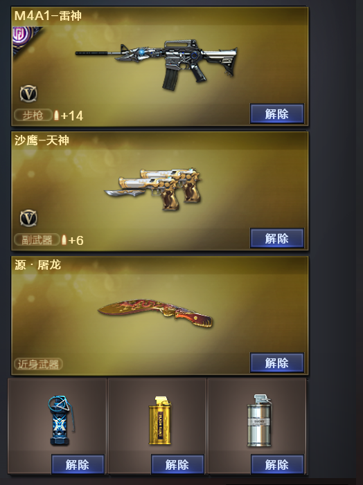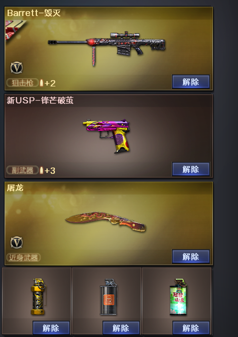 装备描述:烟雾弹玄豹闪光弹玄豹丛林匕首玄豹玄豹高爆手雷雷暴天罚沙鹰天神天戎AK47火麒麟毁灭雷神无影屠龙
