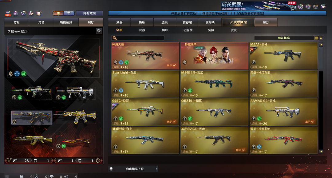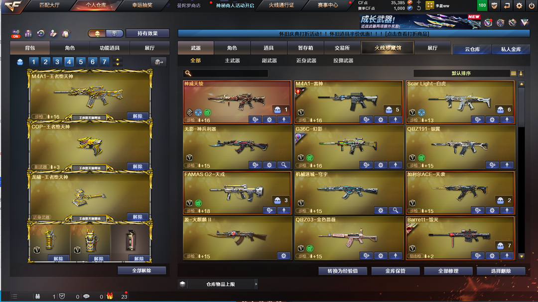 装备描述:【可生化排位】 神威莲华传说,神威天绫传说,加利尔ACE-天袭,法玛斯天戒,芒蝶炽刃,白虎音效卡,炼狱奇幻·国王,G36C-幻影,Barrett-毁灭音效卡;M4A1-雷神,QBZ03-金色蔷薇;Scar Light-白虎音效卡,M4A1-王者堕天神,M14EBR-玄武音效卡,斯太尔蝴蝶;王者武器:AK47-雷暴王者;USP-雷暴王者;麒麟刺-王者堕天神,龙啸-王者堕天神;USP-雷暴王者;