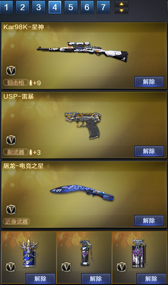 装备描述:王者武器:雷霆王者之锋-觉醒版 英雄武器:烟雾弹-玄豹;闪光弹-玄豹;高爆手雷-玄豹;机械迷城-穹宇;M4A1-雷神;QBZ03-金色蔷薇;高爆手雷-云龙;QBZ03-云龙;云龙扇;烟雾弹-云龙;闪光弹-云龙;COP 357-云龙;黑武士-锦绣游龙;Barrett-极光;沙鹰-天神;龙啸-热带奇洋;手雷-热带奇洋;超新星-热带奇洋;AK47-机械迷城;加特林-炼狱;手雷-云海游龙;擎天-云海游龙;烈龙-云海游龙;烟雾弹-幻灵;闪光弹-幻灵;高爆手雷-幻灵;M200-幻神;龙啸-烈火龙威;烈火-动感闪耀;天神-动感闪耀;屠龙-动感闪耀;手雷-动感闪耀;沙鹰-修罗;M4A1-玫瑰精灵;无影-神兵利器;AK47-火麒麟;Kar98K-星神;Barrett-毁灭;屠龙;AK47-B-战神;Barrett-暗月传说;白虎-电玩蓝兔;闪光弹-竞技荣光;烟雾弹-竞技荣光;高爆手雷-竞技荣光;擎天-竞技荣光;USP-雷暴;柯尔特-竞技荣光;M200-竞技荣光 角色:猎狐者;刀锋;复仇者;堕天使;活力灵狐;精英部队;灵狐者;空;王者-葵-貂蝉;暗夜-X;妲己;樱-青春偶像;紫霞;曼陀罗-礼服;芳心审判者
