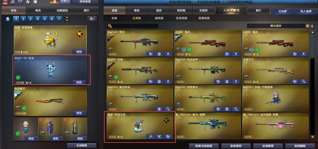 装备描述:生化号|爆破号|神威莲华|传说星骸|传说辉光|传说圣谕|幻神|炼狱-金翼禅狮|斯泰尔蝴蝶|蝴蝶刀2把|五盘六烈|全弹匣|裁决-清泉大圣|mac龙宝|毁灭、裁决音效卡