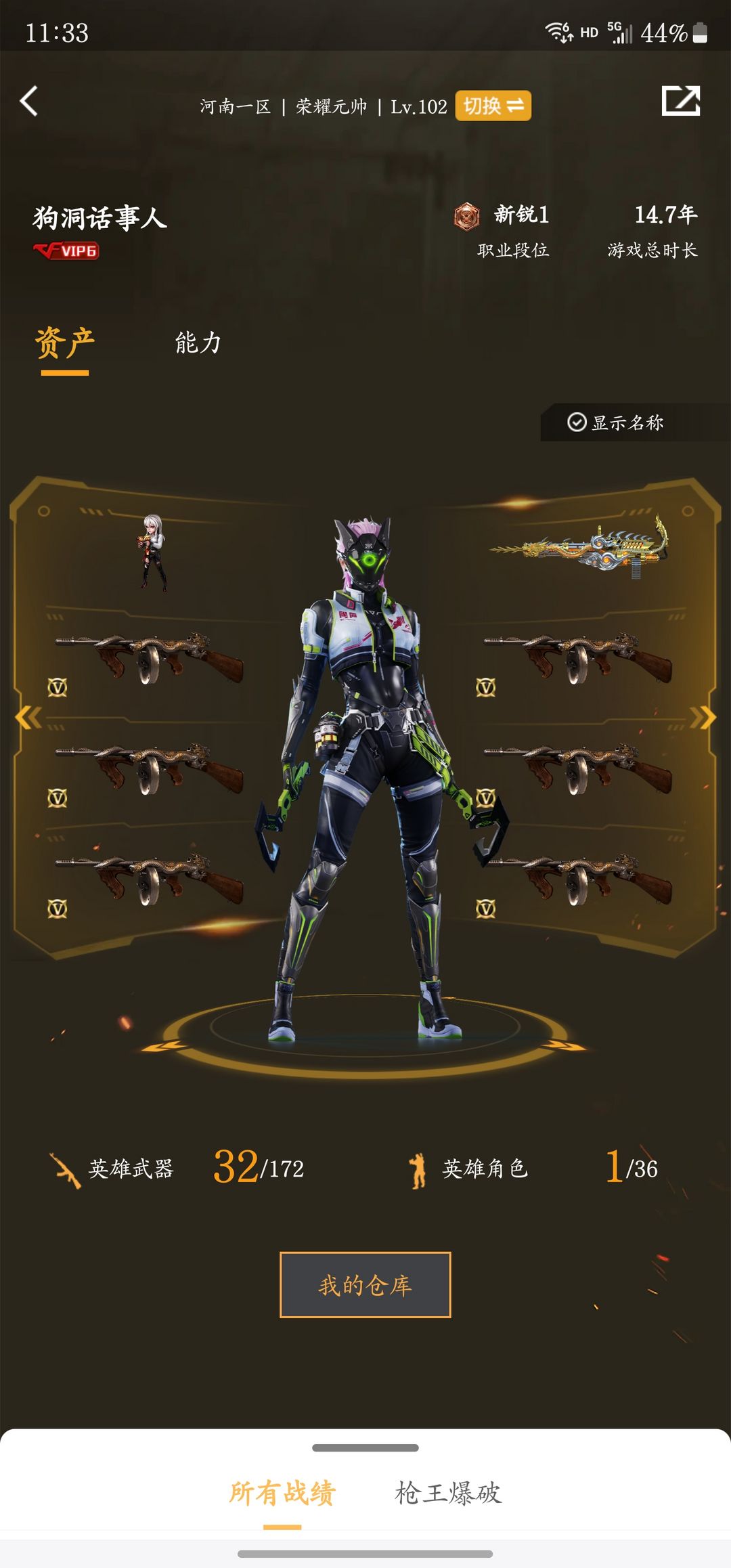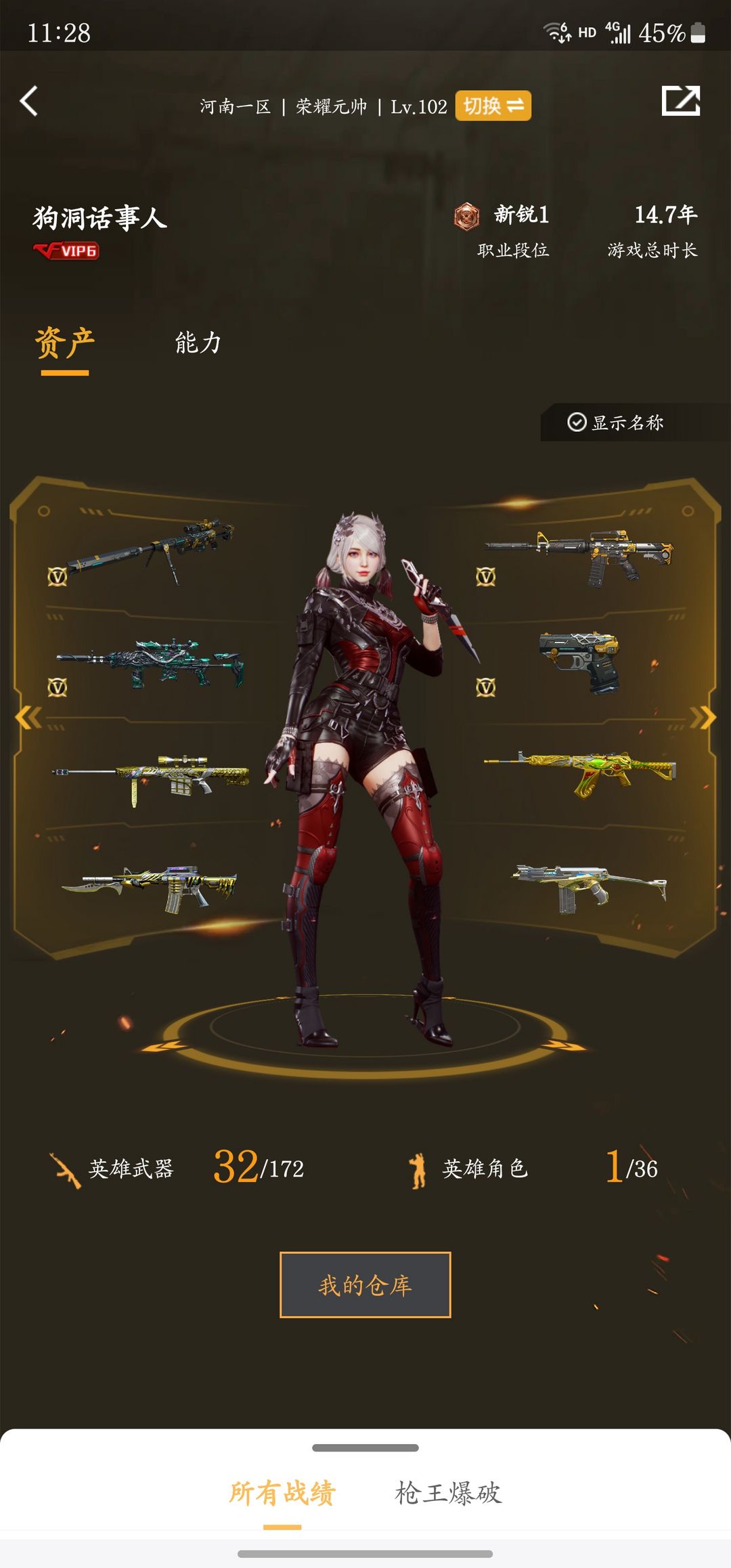 装备描述:王者武器:炼狱-悦蓝-觉醒版;炫金千变;炫金毁灭;王者之烈-觉醒版;王者之灵-觉醒版 英雄武器:机械迷城-穹宇;沙鹰-天神;M4A1-雷神;RPK-盘龙;麒麟刺;汤姆逊-烈龙;黑武士-锦绣游龙;沙鹰-修罗;M14EBR-玄武;高爆手雷-幻灵;M200-幻神;COP 357-幻灵;M4A1-幻灵;闪光弹-幻灵;烟雾弹-幻灵;幻灵之锋;龙啸-烈火龙威;无影-神兵利器;高爆手雷-神工天巧;高爆手雷-竞技荣光;擎天;屠龙 角色:隼;猎狐者;飞虎队;刀锋;海豹突击队;潘多拉;黑鹰;幻影;雷霆-β;白狼;波塞冬;复仇者;堕天使;活力灵狐;兰;G.E.M.邓紫棋;威锋;娜塔莎;救世主;精英部队;灵狐者;烈锋;影武者-X;新娜塔莎;龙儿;救世主-X;蜀雪;潜龙队-X;暗夜-X;北极狐-X;陈龙野-Z;青霞仙子;艾比;妲己;白狼-X;夜玫瑰-X;风暴女;奥摩-X;新曼陀罗;麻雀;剑齿虎-X;圣诞潘多拉-X;虎妞;代号:翼;猎狐者-Y;雪莉杨-摸金校尉;曼陀罗-礼服;芳心审判者;社长刀锋;斯沃特-锋芒精英;兔囡囡;毒蝎-X;超能特工;灵狐-花神;木兰;嘉年华灵狐;维纳斯;沃特X;兰-限定版;狐妖儿;秦师;