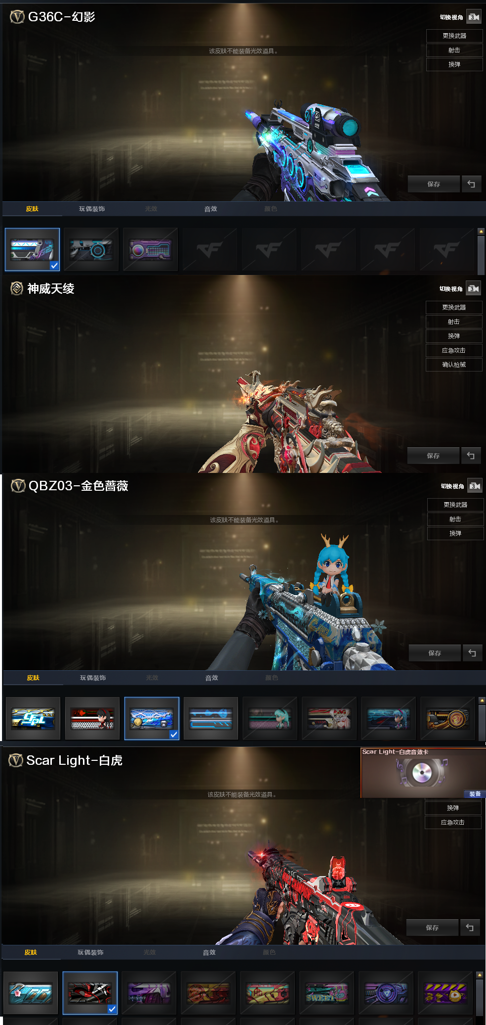 装备描述:排位:可以----------------生化四防全装(可以变更背包、查看生化僵尸血量):无需换弹、4烈、炼狱(带音效)、炼狱-酷酷小狮、斯泰尔幻面灵狐、双面神、死亡之眼、MAC涂鸦、2把炽芒蝶刃、5个生化减速雷、超级对讲机、全部弹匣、、、、、、、、爆破四防:幻神7皮(YZK、KZ、23白鲨、AG、冠军之幻、巅峰荣耀、电竞之星皮肤)、98K星神、、、、、USP雷暴王者、COP王者堕天神、柯尔特竞技荣光、23白鲨柯尔特、无冕之王-柯尔特、2个冠军之特、COP雷霆王者、、、、G36幻影、神威天绫、白虎、QBZ金色蔷薇、、、裁决音效、白虎音效、火麒麟音效、、、1套雷暴、1套竞技荣光、6套雷霆王者、1套雷暴王者、、、生化四防(神威莲华、隼、蛇隐宗)、爆破四防(妮妮、机械姬、王者春、王者小乔、王者影豹、职业经理)