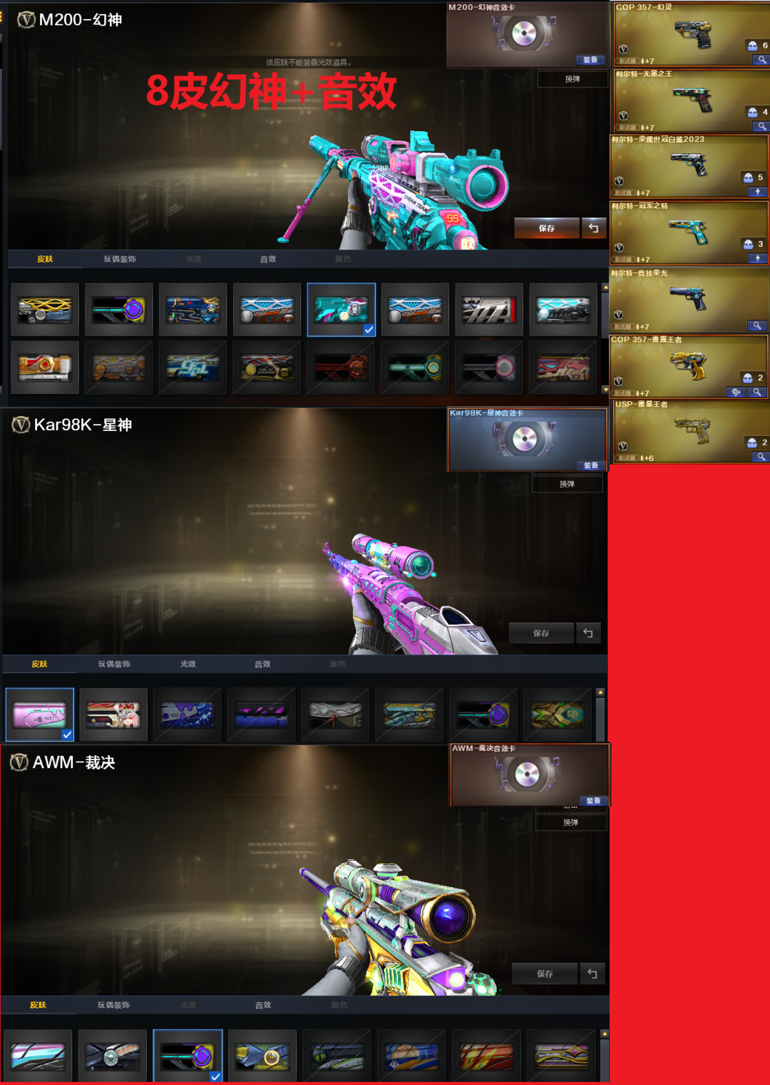 装备描述:排位:可以-----------爆破四防:幻神8皮+音效(传奇欧欧、星火小队、23白鲨、24AG、曹操、巅峰荣耀、周瑜、星耀皮肤)、M200-竞技荣光、98K星神、、、、USP雷暴王者、无冕之王、COP幻灵、柯尔特竞技荣光、23白鲨柯尔特、COP雷霆王者、冠军之特、、、传说暗裔、白虎、QBZ金色蔷薇、炽芒蝶刃、、、1套雷暴、2套堕天神、5套幻灵、2套竞技荣光、7套雷霆王者、、、爆破四防(传说女帝、鹰、星际战将、影豹、王者貂蝉)
