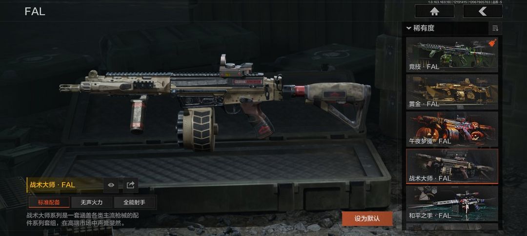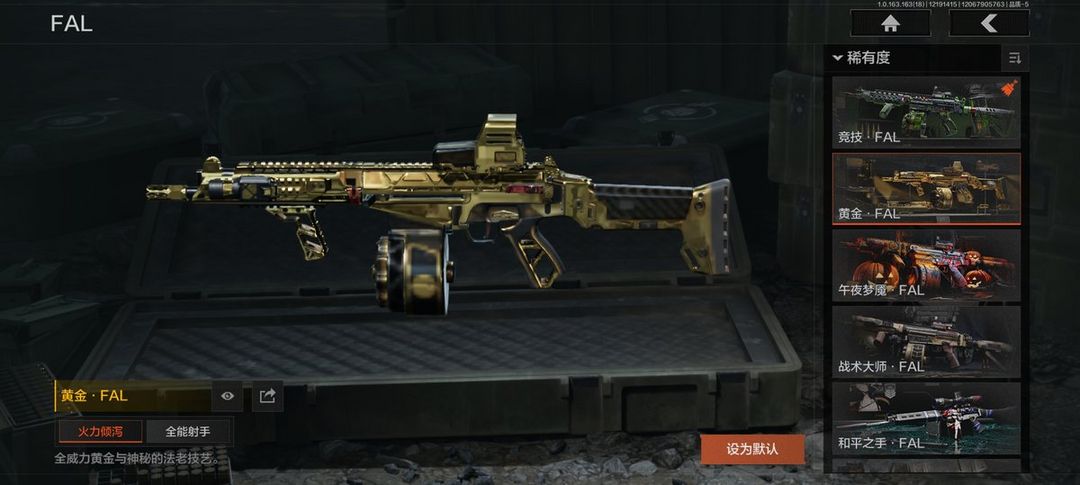 装备描述:30级【角色皮肤】:芭斯特,强尼银手套装,钢铁壁垒作战服,噤声者吉利服,矿山霸主常服,战术甲胄,绅士西服,鎏金街头套装,都市夜影套装,万众狂欢套装,台风IV竞技运动服;【上衣】:最年轻的传奇夹克;【近战武器】:赢家匕首,热能武器补牢,下弦月,涂鸦利刃,胜利军刀,明刀绣春,冬日冰镐,裁决手杖剑,瑞免折刀,野战折刀,冰海战斧,工兵铲,来战开山刀;【手套】:噤声者作战手套,战术甲胃防护手套;【突击步枪】:竞技FAL,黄金FAL,午夜梦魇FAL,战术大师FAL,骑士之剑M4A1,旧王圣谕QBZ191,和平之手FAL,来战AKM,涂鸦AK102,棱光裂变AK74N,来战AK74N,火力倾泻AUG,铁火战痕AUG,竞技AUG,赢家F2000,危崖敌影F2000,骑士之剑AKS74U,最后防线AKS74U,最后防线AEK,胜利锋刃AEK,炎夏浪花AR57,棱光裂变ACE31,骑士之剑ACE31,轰炸小子ACE31,壁垒AN94,典礼武备Groza,龙威T951,利齿风暴T03,鱼跃丹青MCX,典礼武备MCX,飨宴前兆QBZ191,07式林地迷彩QBZ191;【冲锋枪】:利齿风暴MPX,饰金MP5