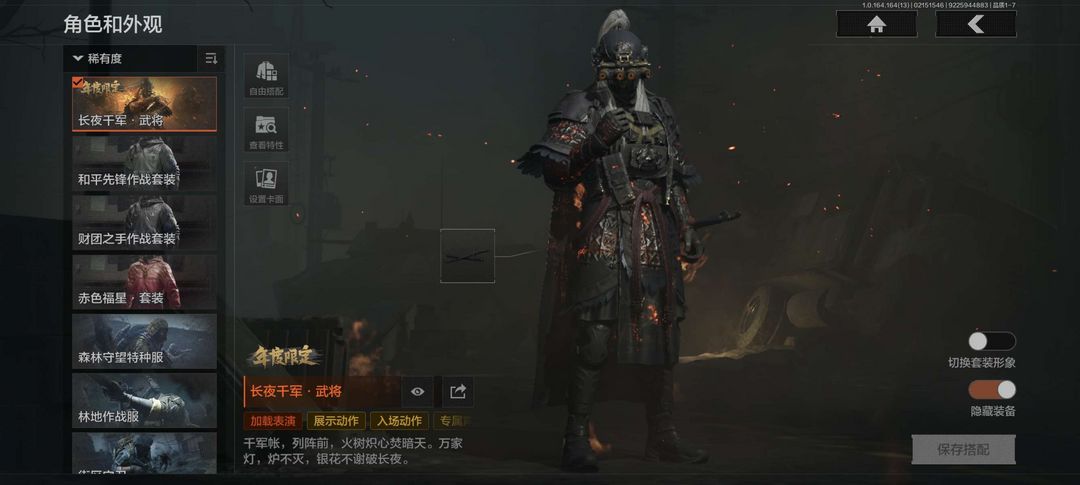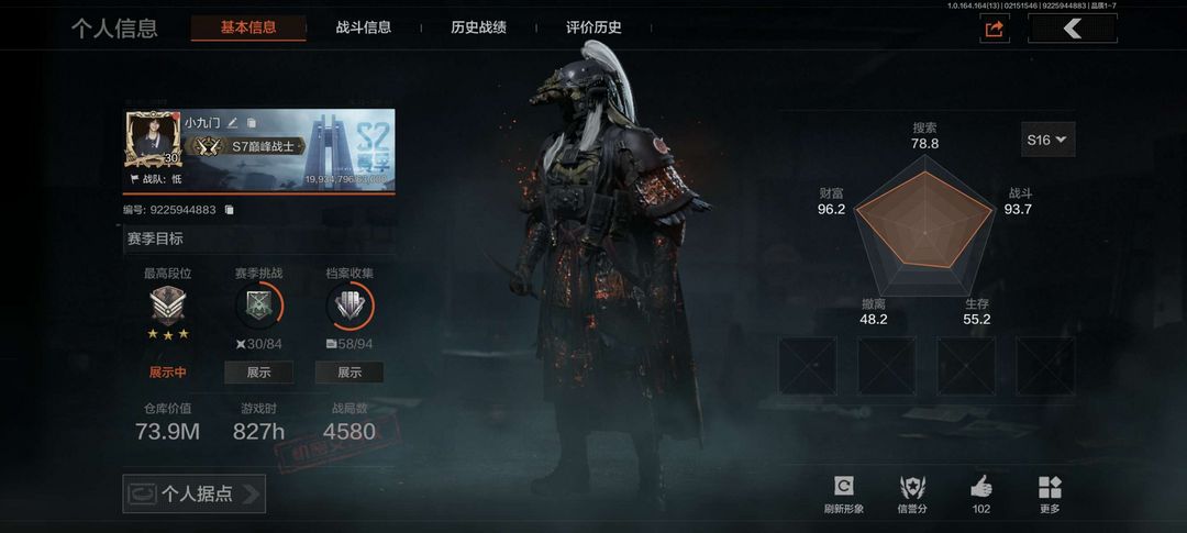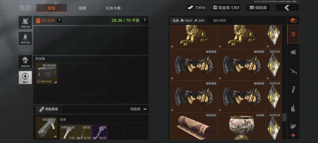 装备描述:仓库总价74m,有13m纯科恩币,还有4张机密和一堆大金,还有6格安全箱,信誉满分,有新年限皮肤长夜武将,有几款刀皮(有明刀绣春),还有很多钥匙,还有很多全装包,全地图开放,请老板们别开挂,谢谢合作。