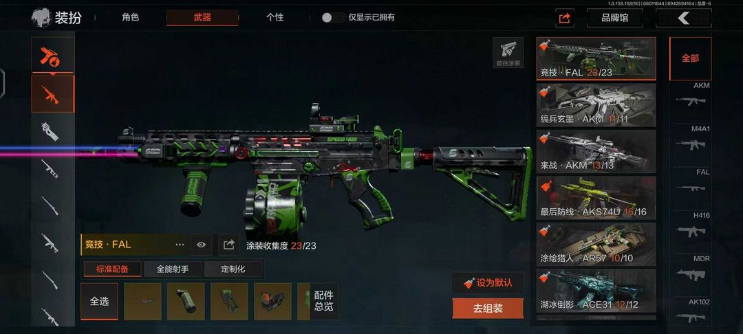 装备描述:近战武器:三尺万仞战术剑,盘牙彻甲短刃,突击匕首,工兵铲;枪皮:竞技FAL,缟兵玄墨AKM,来战AKM,最后防线AKS74U 2手套4衣服