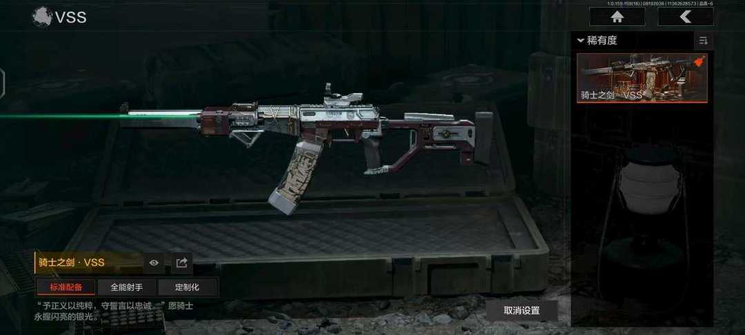 装备描述:钏2515:近战武器】:明刀绣春,工兵铲,来战开山刀;【突击步枪】:蓝色咆哮H416,棱光裂变AKM,来战AKM,德尔塔小队M4A1,自喷网格H416,德尔塔小队H416,北国内卫MDR,棱光裂变AK102,竞技AUG,棱光裂变AK74N,来战AK74N,骑士之剑AKS74U,钢铁真理F2000,涂绘猎人AR57,骑士之剑ACE31,最后防线AEK,北国内卫AN94,07式林地迷彩QBZ191;【冲锋枪】:掌中盾MP5,龙威MP5,灰鼠幻歌P90,神锋Vector45;【射手步枪】:骑士之剑VSS,棱光裂变QBU191,骑士之剑MK14,玄戈梨花M110;【栓动步枪】:棱光裂变莫辛,白色丧钟莫辛,骑士之剑SJ16;【霰弹枪】:无畏USAS12