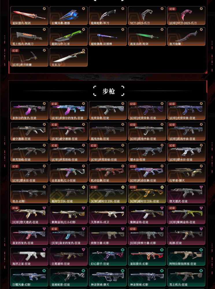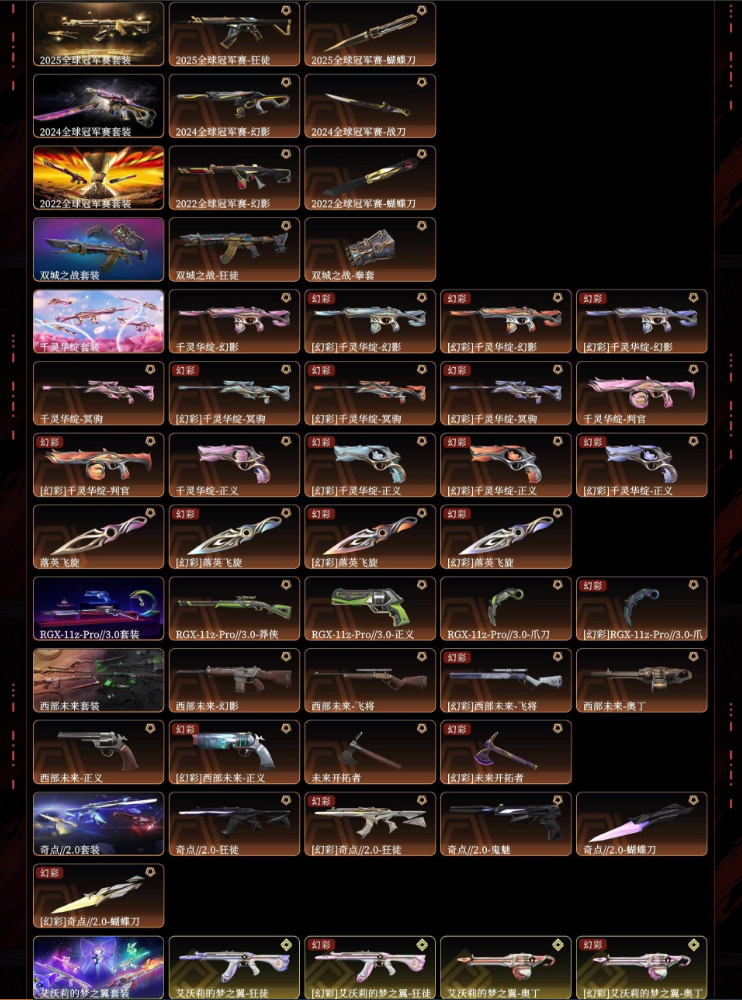 装备描述:2025冠军2024冠军2022冠军双城之战千灵华绽显卡3.0西部未来奇点2.0艾莉沃的梦之翼源能者娱乐系统般若假面2.0离子武器咒缚双界掠影vct爪刀超限闪存匕首多弥尔的复仇狂徒光荣异象狂徒虚空遗器狂徒混沌序曲狂徒塑水宗狂徒全息波普2.0狂徒机动狂飙狂徒奇点幻影超时空卫队狂徒堕天遗武狂徒紫阙金琅2.0幻影紫阙金琅狂徒盖亚的复仇狂徒侦察力量幻影海洋之星狂徒日冕雄狮狂徒起源狂徒塑水宗飞将偃月苍龙冥驹堕天遗武冥驹起源冥驹紫阙金琅2.0奥丁光明哨兵2.0骇灵奇点骇灵天界神兵蜂刺机动狂飙雄鹿起源雄鹿vctedg标配vctprx标配奇点正义起源狂怒