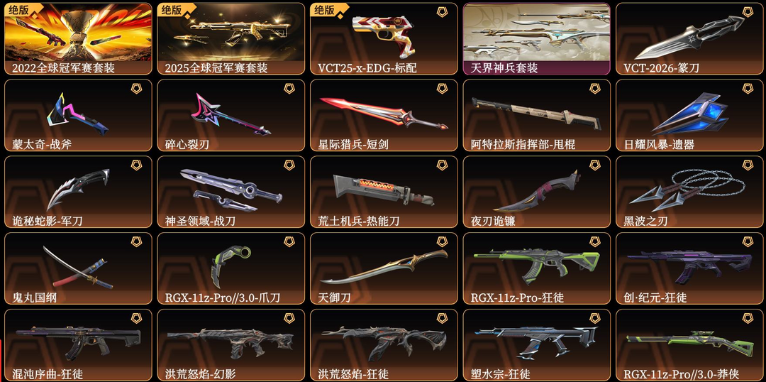 可排位✅顶级10W库存✅22冠军套⭐25冠军套⭐天界神兵套⭐VCT爪刀⭐回火礼包⭐塑水宗⭐千灵华绽⭐