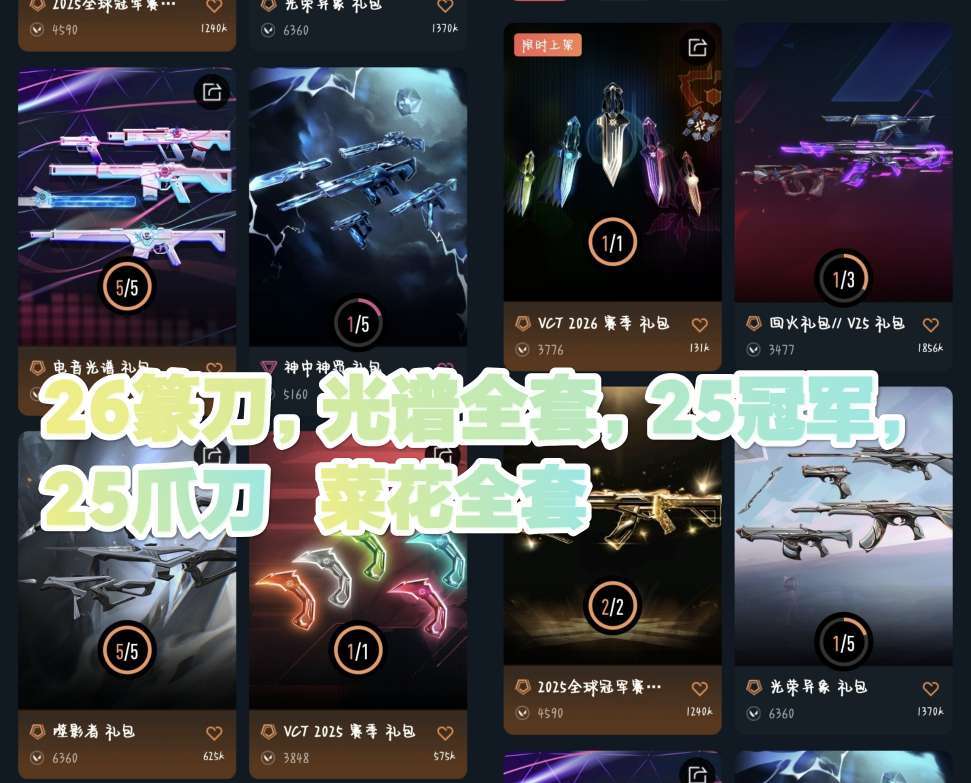 装备描述:26篆刀,25冠军全套,25爪刀,25EDG标配,光谱全套,菜花全套,天界鬼魅,塑水正义,盖亚AK,盖亚幻影,起源喷,光荣大狙,神中神罚莽侠,漫画骇灵,西部奥丁等