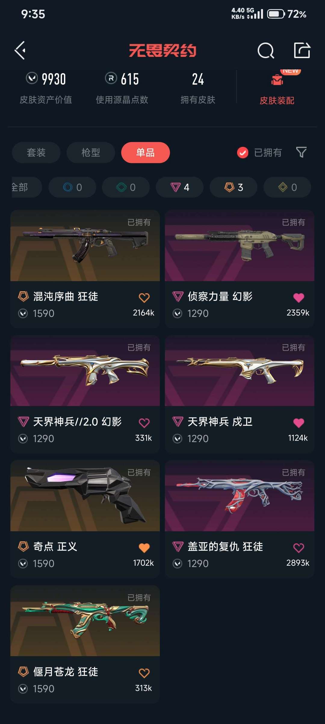 全英雄,枪皮只有几个主站皮肤。偃月,混沌,盖亚AK。侦查,天界幻影。天界戍卫。奇点正义