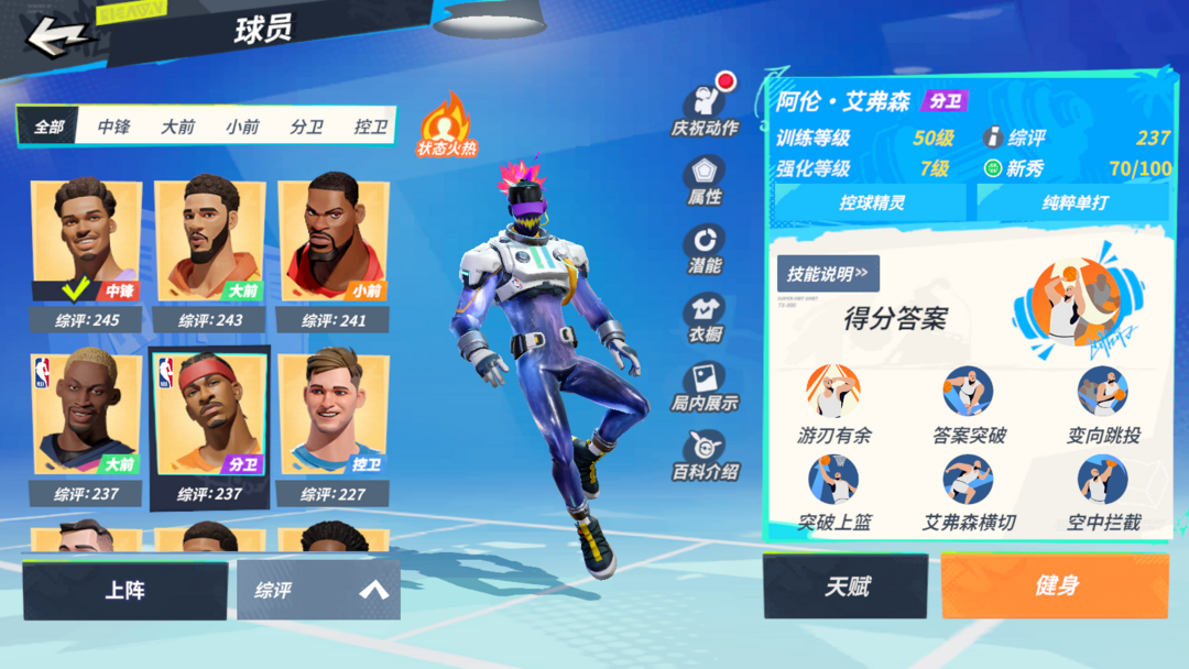 装备描述:宇航员全套资源号7文班、7塔图姆、7亚历山大、7杜兰特、7克城之子詹姆斯、7罗德曼、7艾弗森;2字母2小卡2韦德2JB1老詹1大梦1鸭梨1朱霍7乔治7狐狸7小贾伦7东契奇全满天赋