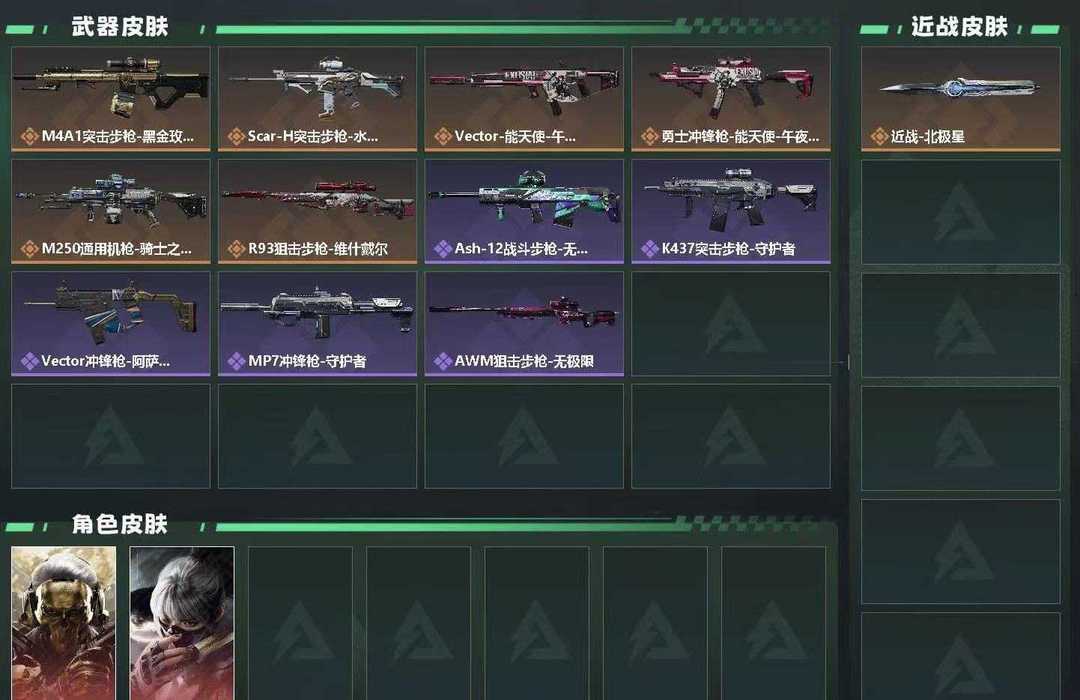 装备描述:红狼/水墨/北极星 【玩家信息】行动等级:60,三角洲巅峰,战场等级:11,列兵, 【哈夫币】14877w 【总资产】230.5M 【特勤处】技术中心Lv3/工作台Lv3/制药台Lv3/防具台Lv3/仓库Lv7/指挥中心Lv3/训练中心Lv4/靶场Lv4 【安全箱】 S6高级安全箱6(2x3) 【通行证】烽火地带限定版 【角色皮肤】红狼-蚀金玫瑰/骇爪-水墨云图 【近战皮肤】黑鹰/近战-北极星 【捆绑包】鹅鸭杀捆绑包/狩猎时刻捆绑包 【狙击步枪皮肤】R93狙击步枪-维什戴尔/AWM狙击步枪-无极限 【步枪皮肤】G3战斗步枪-骑士/SCAR-H战斗步枪-启航/M4A1突击步枪-蚀金玫瑰/SCAR-H战斗步枪-水墨云图/ASh-12战斗步枪-无极限/SR-3M紧凑突击步枪-战术竞备/K437突击步枪-守护者 【机枪皮肤】M250通用机枪-骑士之心 【冲锋枪皮肤】勇士冲锋枪-能天使-午夜邮差/MP7冲锋枪-守护者/Vector冲锋枪-能天使-午夜邮差/MP5冲锋枪-战术竞备/P90冲锋枪-紧急戒备/Vector冲锋枪-阿萨拉文明 【精准射击步枪皮肤】SR-25射手步枪-水墨云图