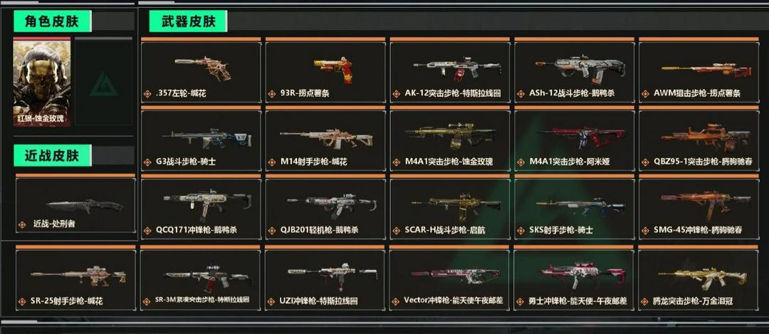 百万哈夫币 红狼-蚀金玫瑰/处刑者/黑鹰/近战2 枪皮数量135战场等级35军士