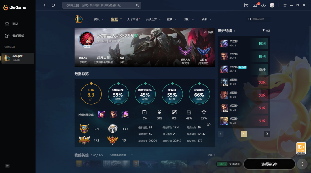 限制: 撤单率<50%才可租用此帐号英雄: 172