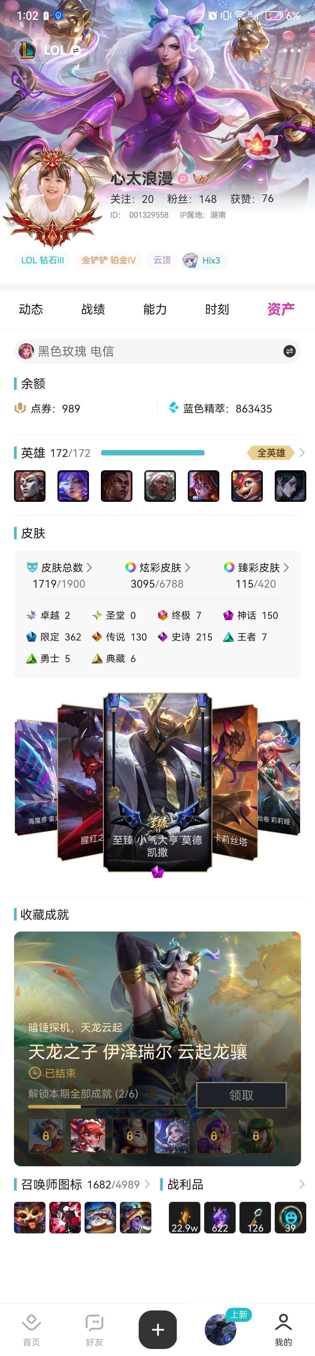 装备描述:殿堂传奇满,冰原女警,冰原酒桶,莲花之令卡尔玛 龙虾带炫彩 钻石框,真彩炫彩多,下棋棋盘小小英雄多