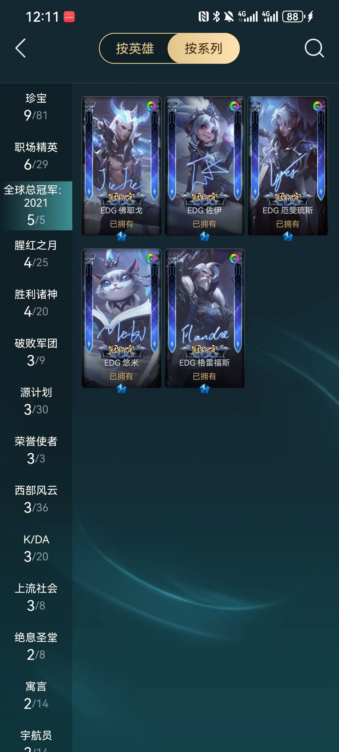 装备描述:全套EDG签名版冠军皮肤含炫彩,单双排华贵铂金段位