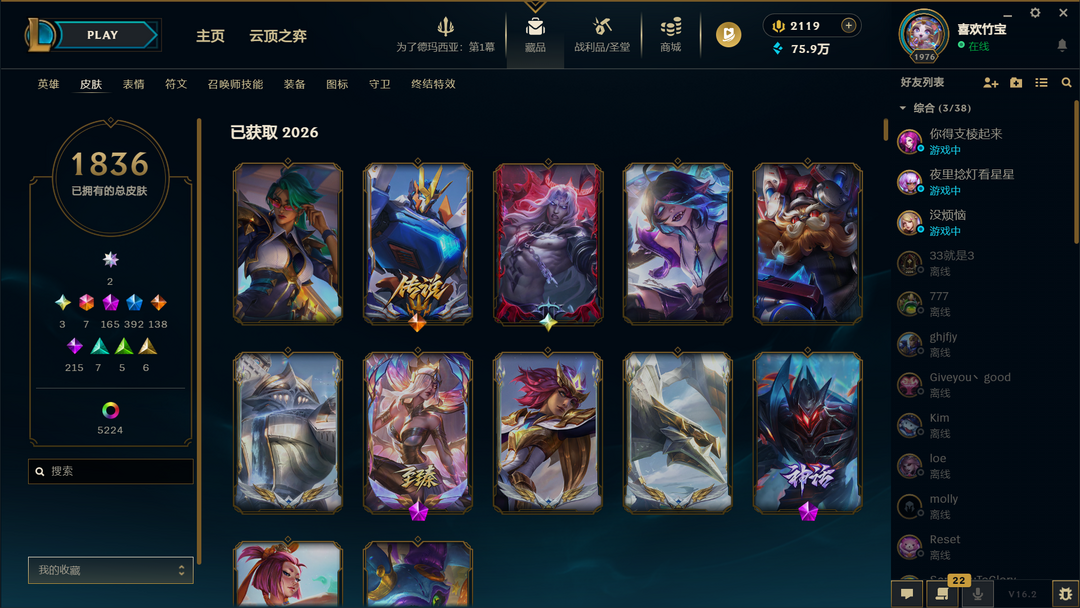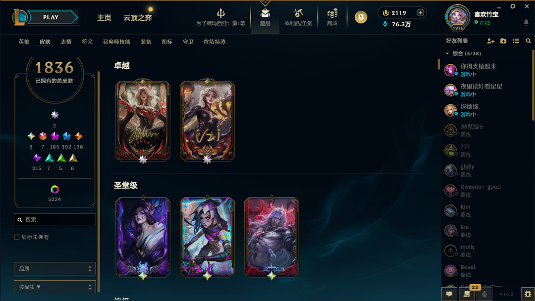 原皮1838+5265炫妹子号⭐圣堂佛耶戈金克丝莫甘娜⭐臻彩全区第五⭐暗影卢锡安娜美⭐两套顶配名人堂