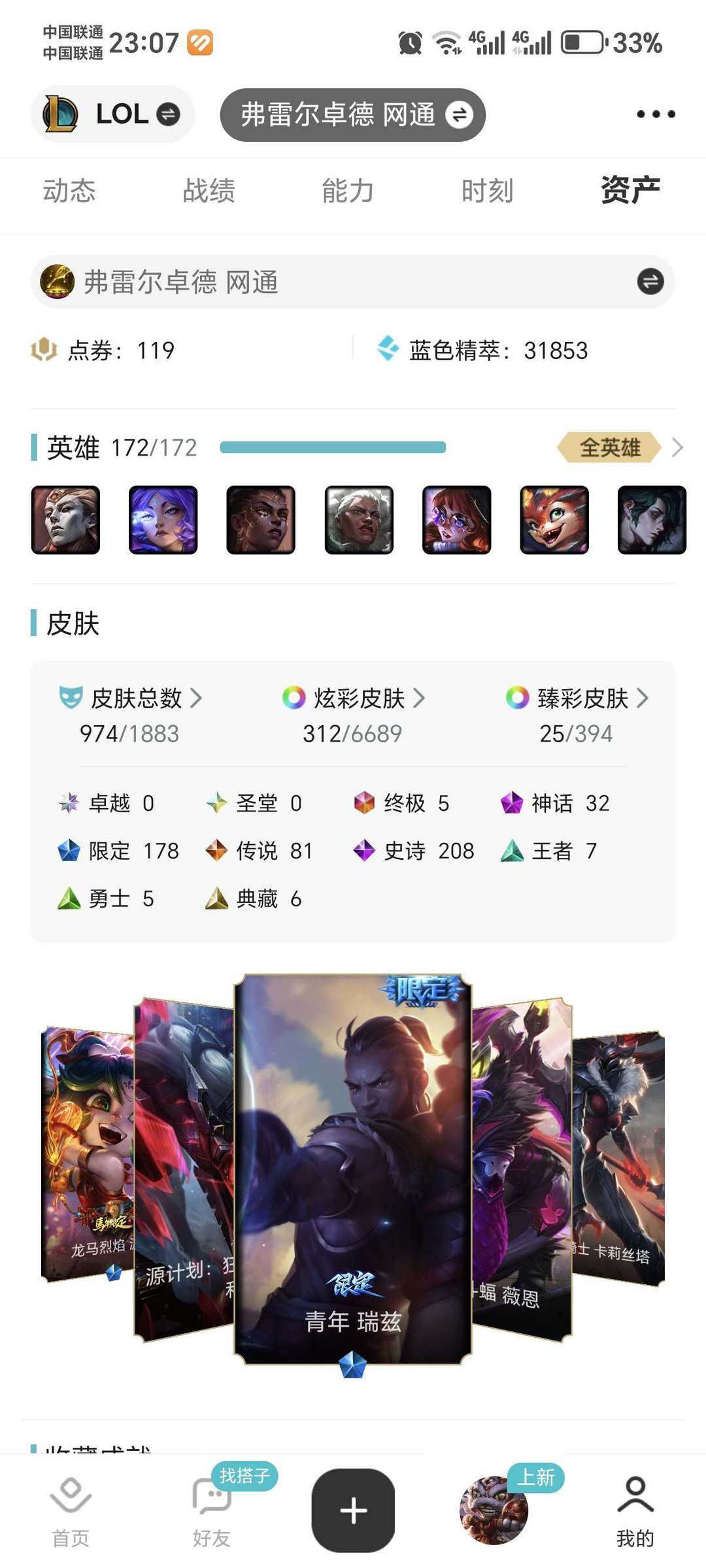 全英雄,可排位974皮肤312炫彩25臻彩有天使银白审判斩星魔剑易诺手二周年恐惧新星摄魂VN臻彩瞎子