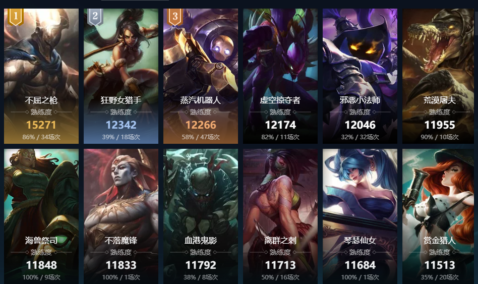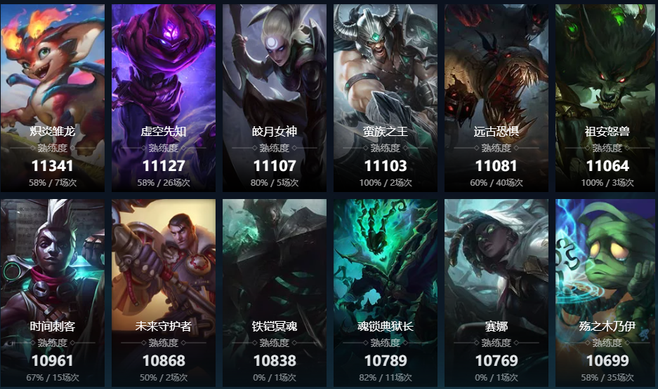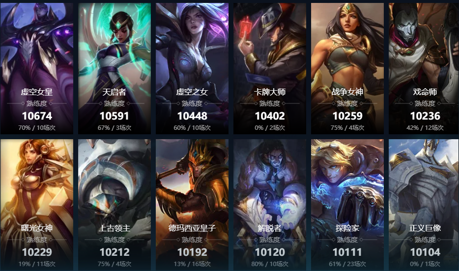 曙光女神;百裂冥犬;寒冰射手;皮城女警;赏金猎人;黑暗之女;卡牌大师;远古恐惧;无极剑圣;战争女神;