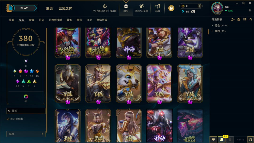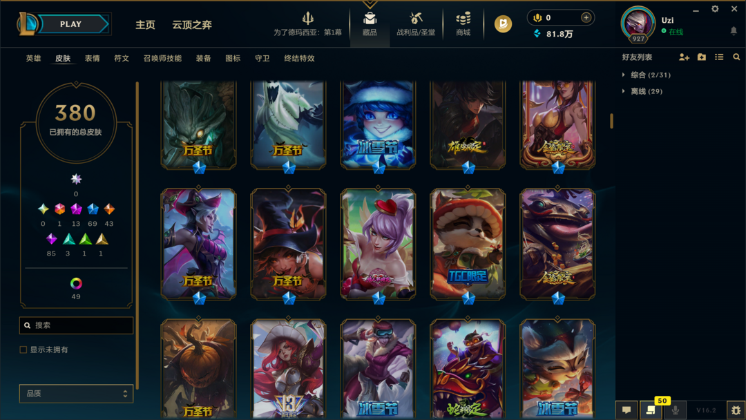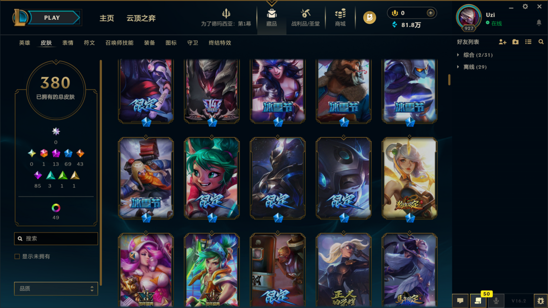 可排位4000皮肤〓20至臻海克斯〓无影天煞劫〓穿星创星〓冰雪节限定