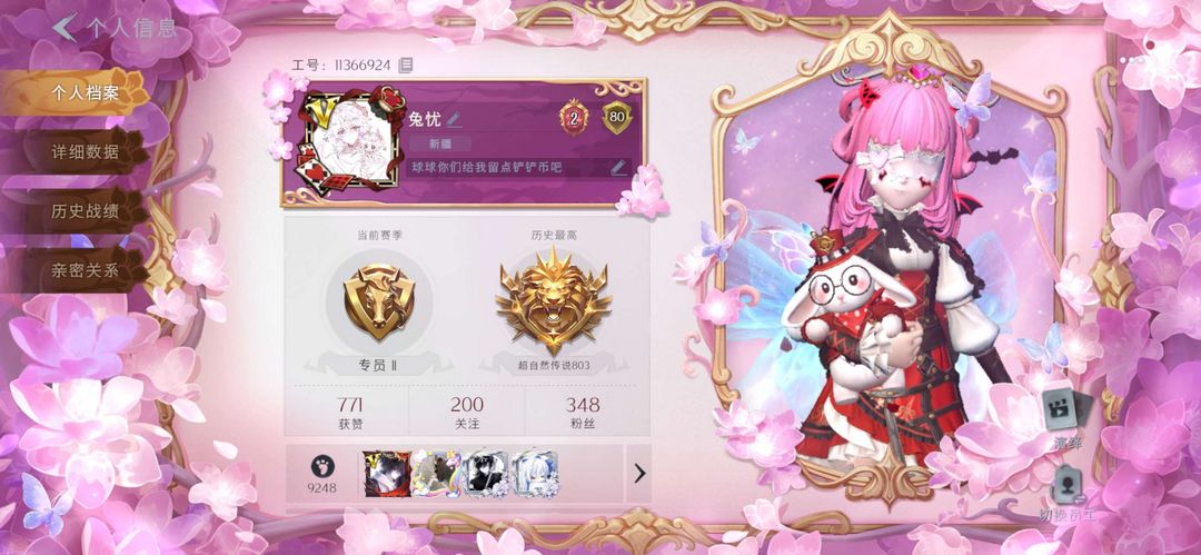 限制: 撤单率<80%才可租用此帐号装备描述:❗具体看图,有兔宝,二字ID真全图鉴不暇,新东西一般会立马补 ❗租完到点被挤号禁止互挤!租完到点被挤号禁止互挤!租完到点被挤号禁止互挤! ❗文明租号游戏,禁止恶意撤单,否则永久拉黑,不能改ID不能动资源,不能辱骂其他玩家,说脏话,不要有修改密码等动机不纯的行为,发现直接拉黑。 ❗到点被顶号后勿恶意挤号,本号一租一密,有登录不上或被挤号可以申请撤销,原因选被挤号,这样客服会提醒我改密码,注意不要申请密码错误。退款申请为客服自动处理。 ❗建议点击左下角收藏此账号,因为在其他平台被租了的话会暂时下架,空闲了就会重新上架。 ❗勿开挂毁号,下单默认已读平台租号条律,开挂或毁号导致封号的,平台会配合给出ip地址个人信息等,根据刑法第275条故意毁坏公私财物规定:数额较大或者有其他严重情节的,处三年以下有期徒刑、拘役或者罚金;数额巨大或者有其他特别严重情节的,处三年以上七年以下有期徒刑。立案追诉标准:造成公私财产物损失两千元以上的就允许立案追查,切勿以身试法。