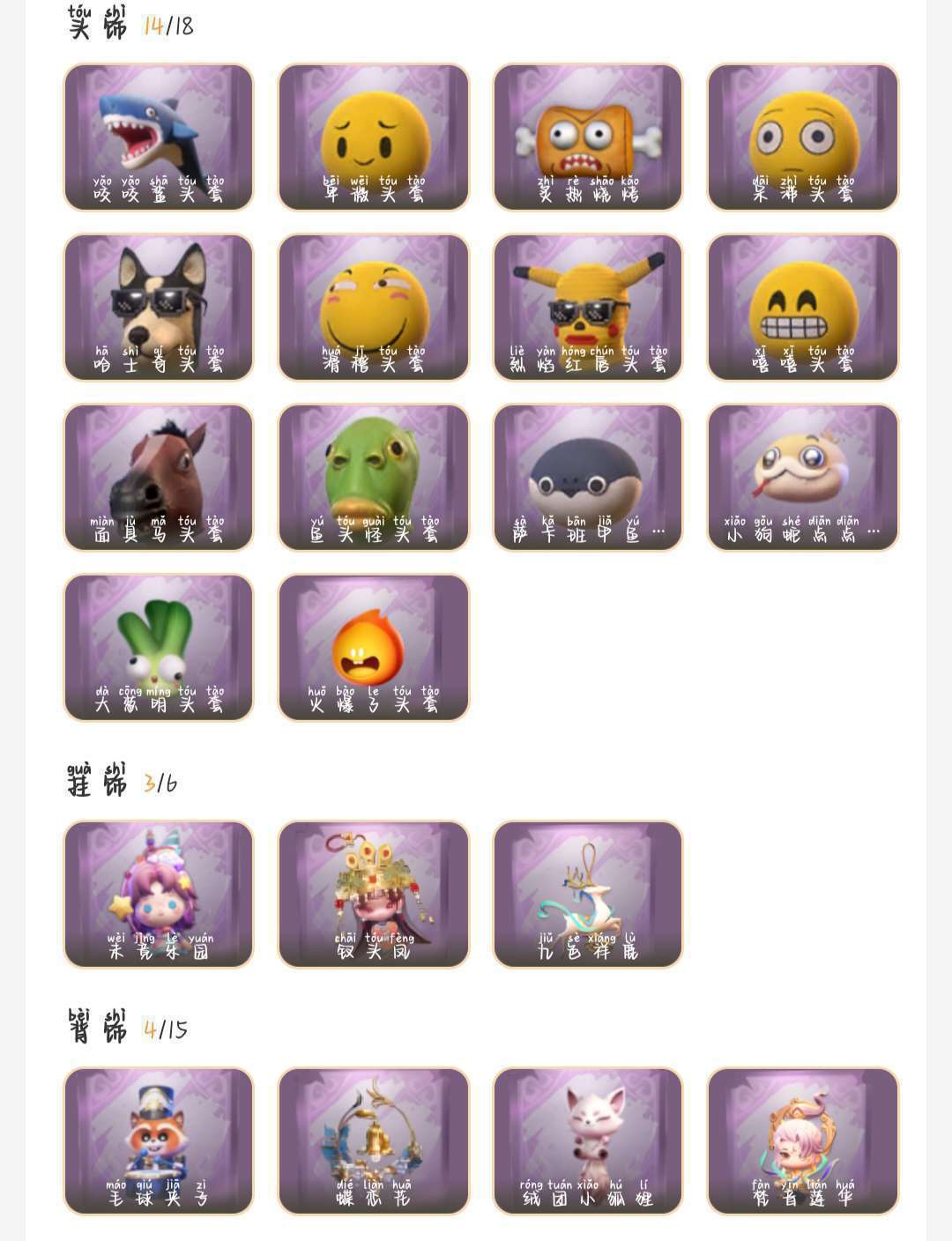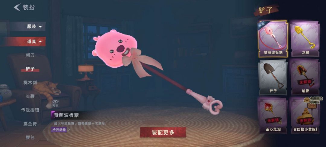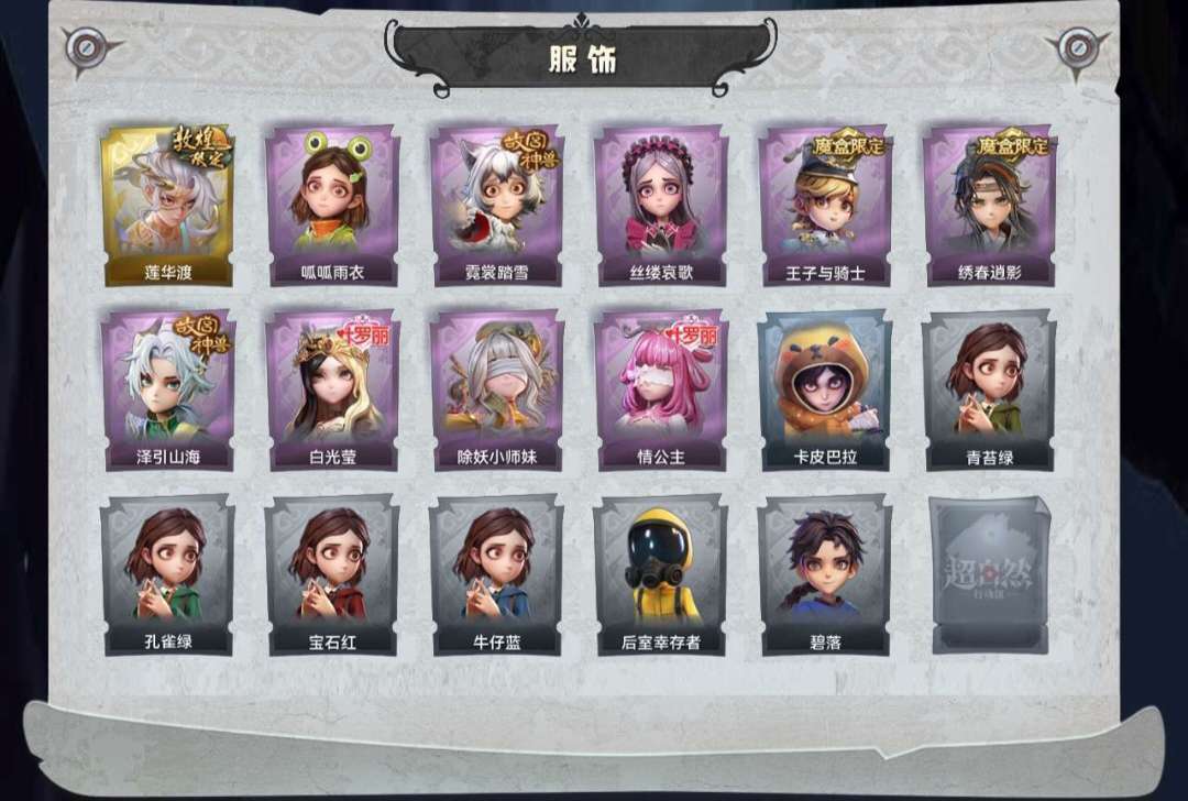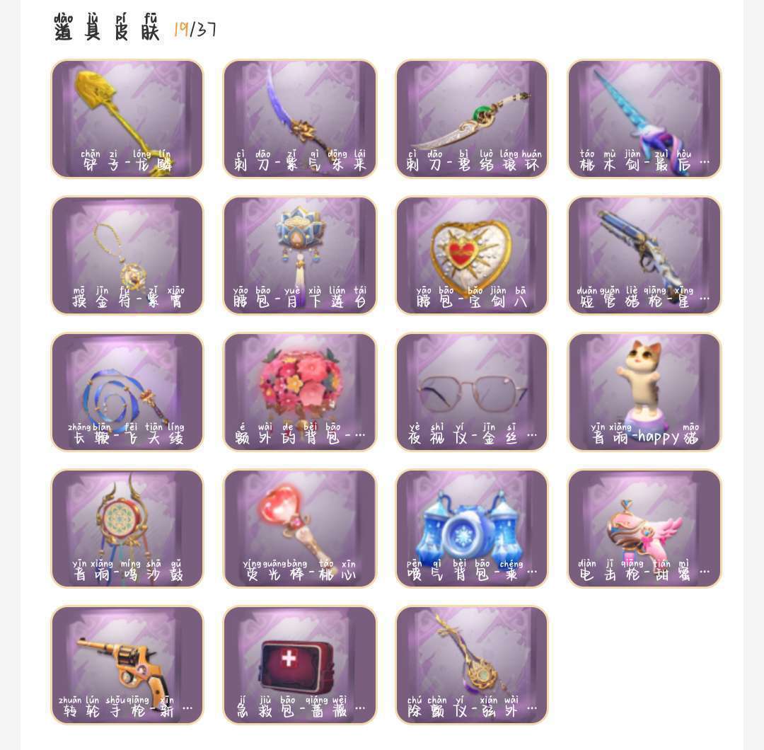 装备描述:刺刀-紫气东来,刺刀-碧络琅环,铲子-龙鳞,桃木剑-最后的独角兽,长鞭-飞天绫,摸金符-紫霄,腰包-月下莲台,腰包-宝剑八,短管猎枪-星光的裁决,夜视仪-金丝眼镜,音响-鸣沙鼓,荧光棒-桃心-荧光棒-桃心,喷气背包-乘风溯雪,转轮手枪-新星时代,电击枪-甜蜜泡泡枪,除颤仪-弦外之音,急救包-蔷薇物语,黄牛-珍珠芭乐莓莓