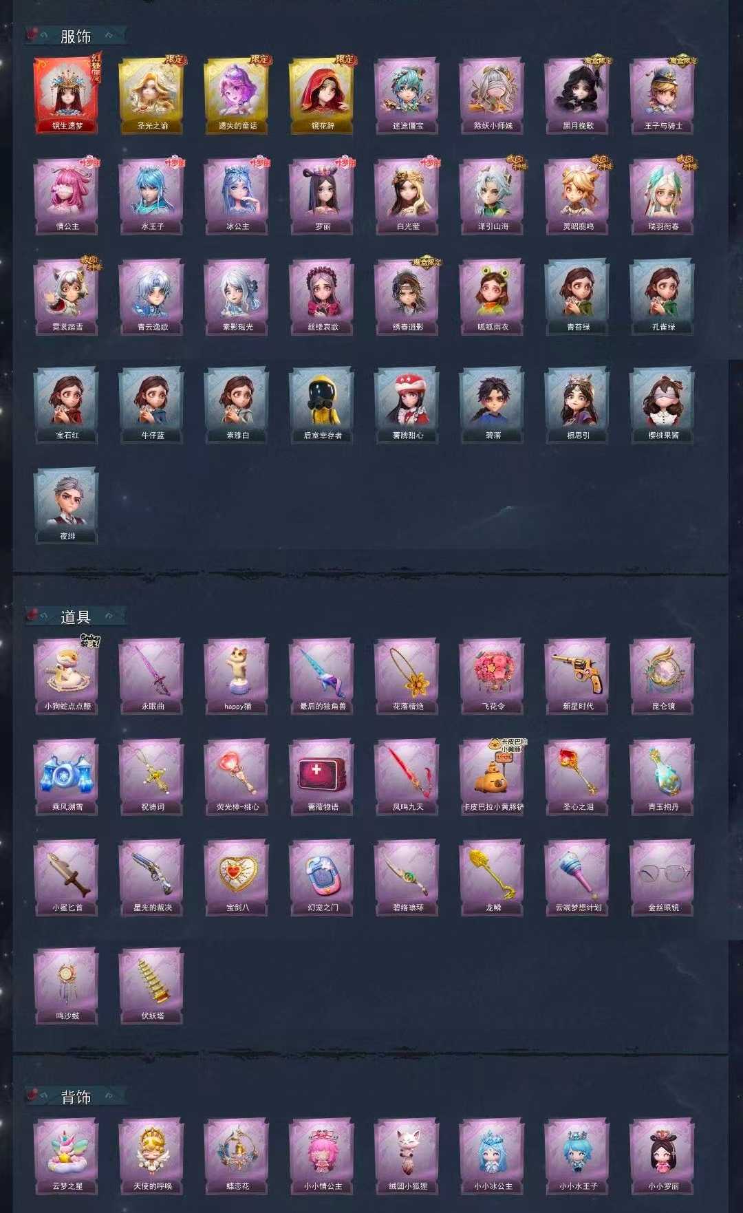 装备描述:超自然1红3金17紫 碧络琅环 小鲨匕首 龙鳞 圣心之泪 最后的独角兽 永眠曲 凤鸣九天 小狗蛇点点鞭 昆仑镜 幻宠之门 花落精绝 祝祷词 宝剑八 星光的裁决 云端梦想计划 伏妖塔 青玉抱丹 飞花令 金丝眼镜 happy猫 桃心荧光棒 乘风溯雪
