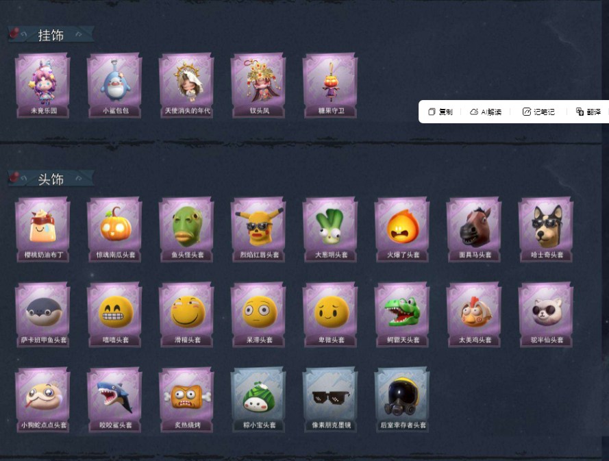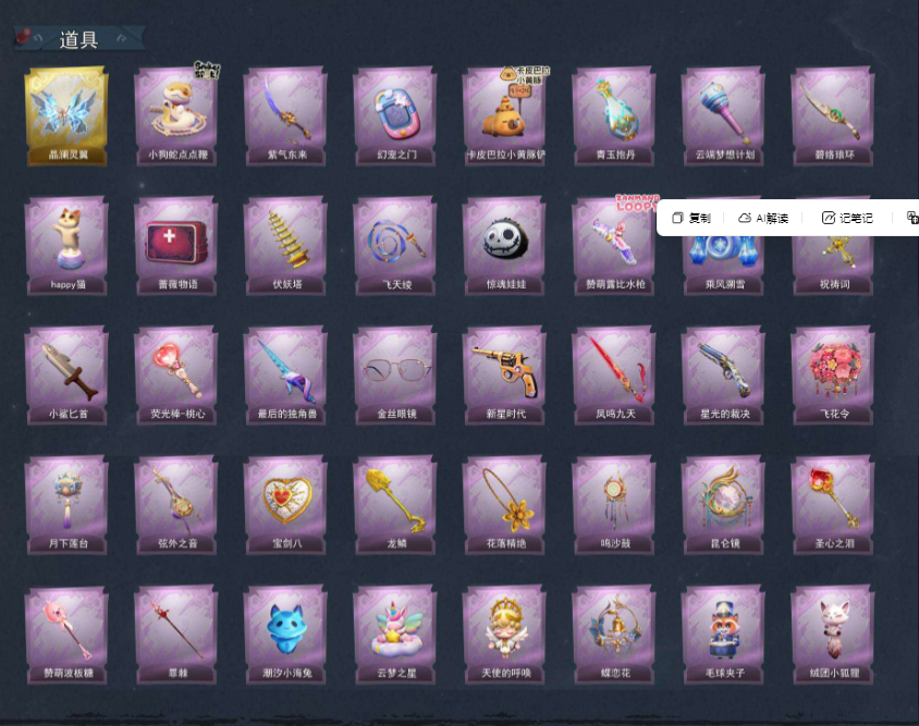 装备描述:【段位】超自然传说 【幻梦皮肤数量】1 【金色皮肤数量】4 【紫色皮肤数量】19 【道具皮肤数量】37 【累充】50640金砖 【赛季魔盒】稀世豪华魔盒 【员工】小黄、爱丽丝、零、阿念、逍遥、薇薇安、巫铃儿、莉莉、艾伦、爱德华、兰 【幻梦皮肤】巫铃儿-镜生遗梦 【金色皮肤】逍遥-莲华渡、薇薇安-圣光之谕、小黄-遗失的童话、巫铃儿-镜花辞 【紫色皮肤】薇薇安-仙锋小姐、莉莉-莓果陷阱、阿念-迷途僵宝、莉莉-除妖小师妹、阿念-王子与骑士、莉莉-情公主、艾伦-水王子、爱丽丝-冰公主、小黄-罗丽、薇薇安-白光莹、逍遥-泽引山海、阿念-灵昭鹿鸣、爱丽丝-瑞羽衔春、小黄-霓裳踏雪、零-青云逸歌、巫铃儿-素影瑶光、爱丽丝-丝缕哀歌、逍遥-绣春逍影、小黄-呱呱雨衣 【道具皮肤】喷气背包-晶澜灵翼、长鞭-小狗蛇点点鞭、刺刀-紫气东来、传送按钮-幻宠之门、铲子-卡皮巴拉小黄豚铲、黄牛能量饮料-青玉抱丹、专业手电-云端梦想计划、刺刀-碧络琅环、音响-happy猫、急救包-蔷薇物语、葫芦-伏妖塔、长鞭-飞天绫、腰包-惊魂娃娃、短管猎枪-赞萌露比水枪、喷气背包-乘风溯雪、摸金符-祝祷词、刺刀-小鲨匕首、桃木剑-
