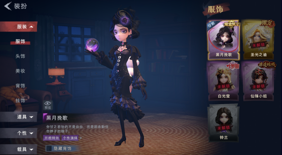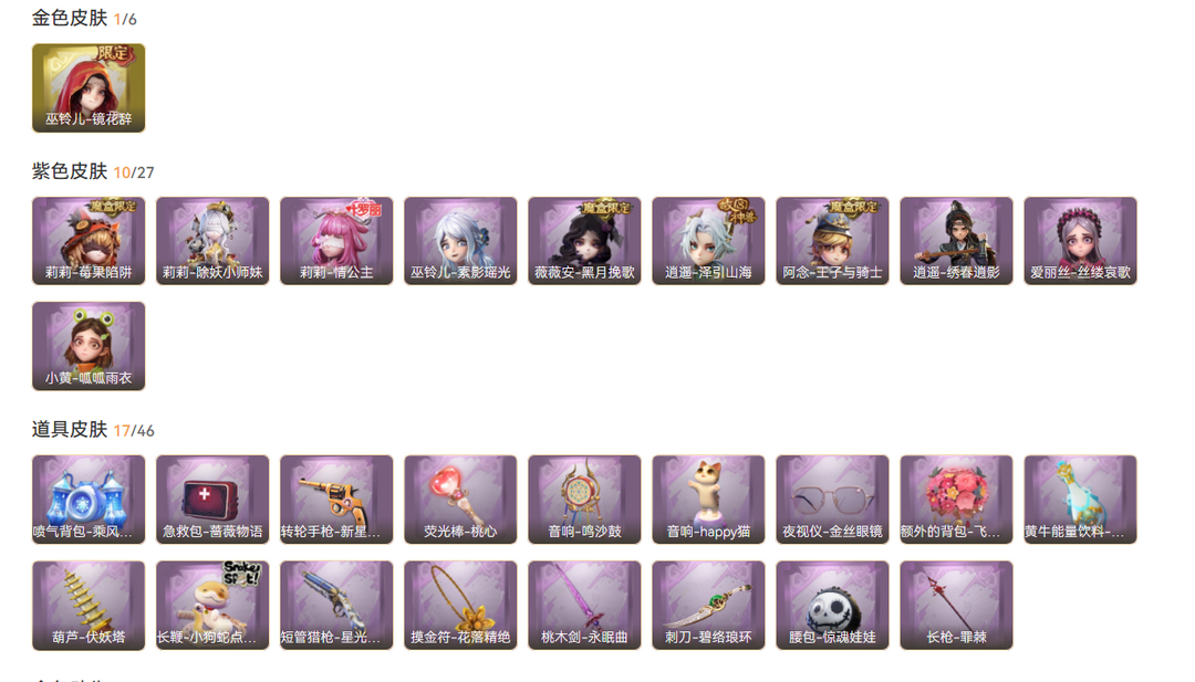 装备描述:镜花辞黑月薇薇安白泽逍遥莉莉全皮除妖师草莓一耀世十紫超多道具头饰