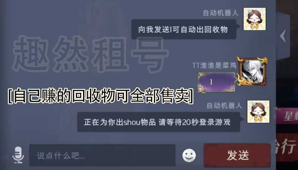 限制: 撤单率<45%才可租用此帐号装备描述:禁止打g 恶意消耗铲铲币等低素质行为 违者发现永久拉黑 向机器人发1可自动出自己全部回收物 账号自动改密 一单一密 开挂导致封号行为必上报平台通过支付信息起诉