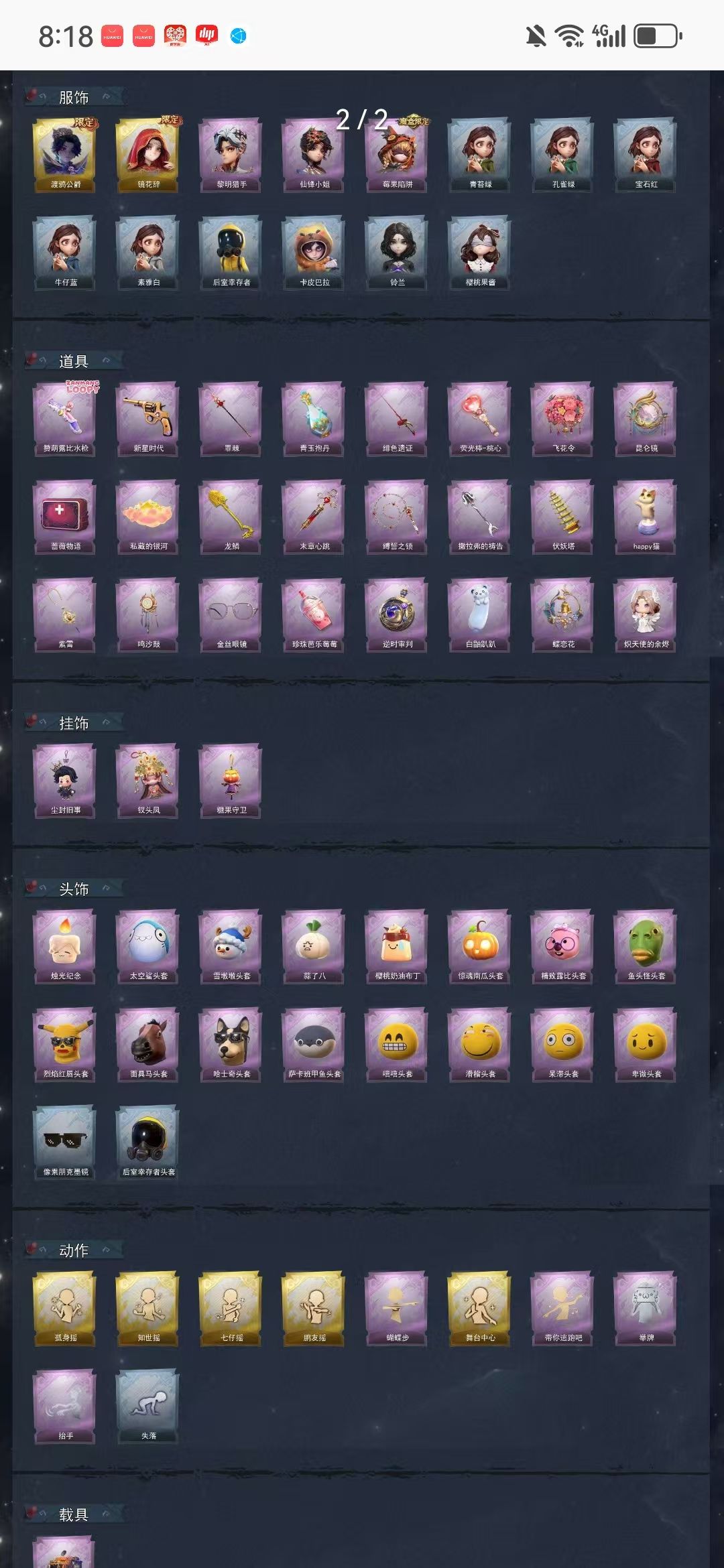 装备描述:【金色皮肤】零-渡鸦公爵、巫铃儿-镜花辞 【紫色皮肤】艾伦-黎明猎手、薇薇安-仙锋小姐、莉莉-莓果陷阱 【道具皮肤】短管猎枪-赞萌露比水枪、转轮手枪-新星时代、黄牛能量饮料-青玉抱丹、桃木剑-绯色遗证、额外的背包-飞花令、传送按钮-昆仑镜、急救包-蔷薇物语、腰包-私藏的银河、铲子-龙鳞、急救包-末章心跳、长鞭-缚誓之锁、铲子-撒拉弗的祷告、葫芦-伏妖塔、音响-happy猫、摸金符-紫霄、音响-鸣沙鼓、夜视仪-金丝眼镜、黄牛能量饮料-珍珠芭乐莓莓、传送按钮-逆时审判、背饰-白鼬趴趴、背饰-蝶恋花、背饰-炽天使的余烬 【载具】惊奇万圣涂装