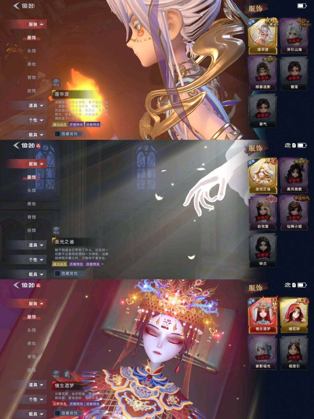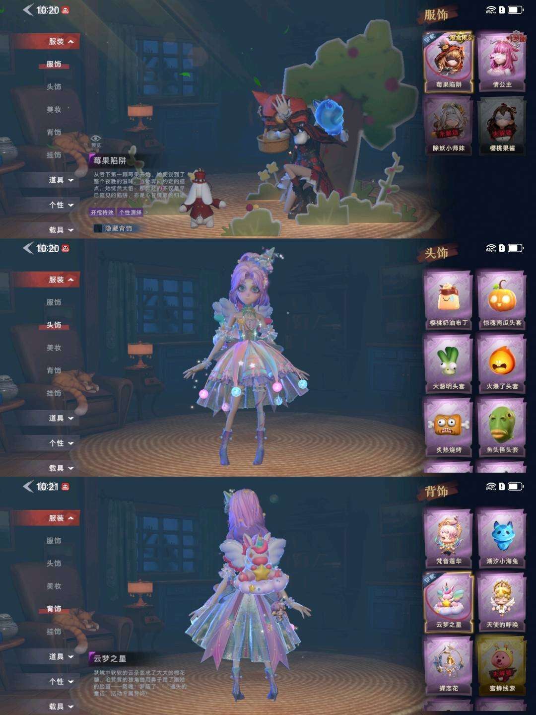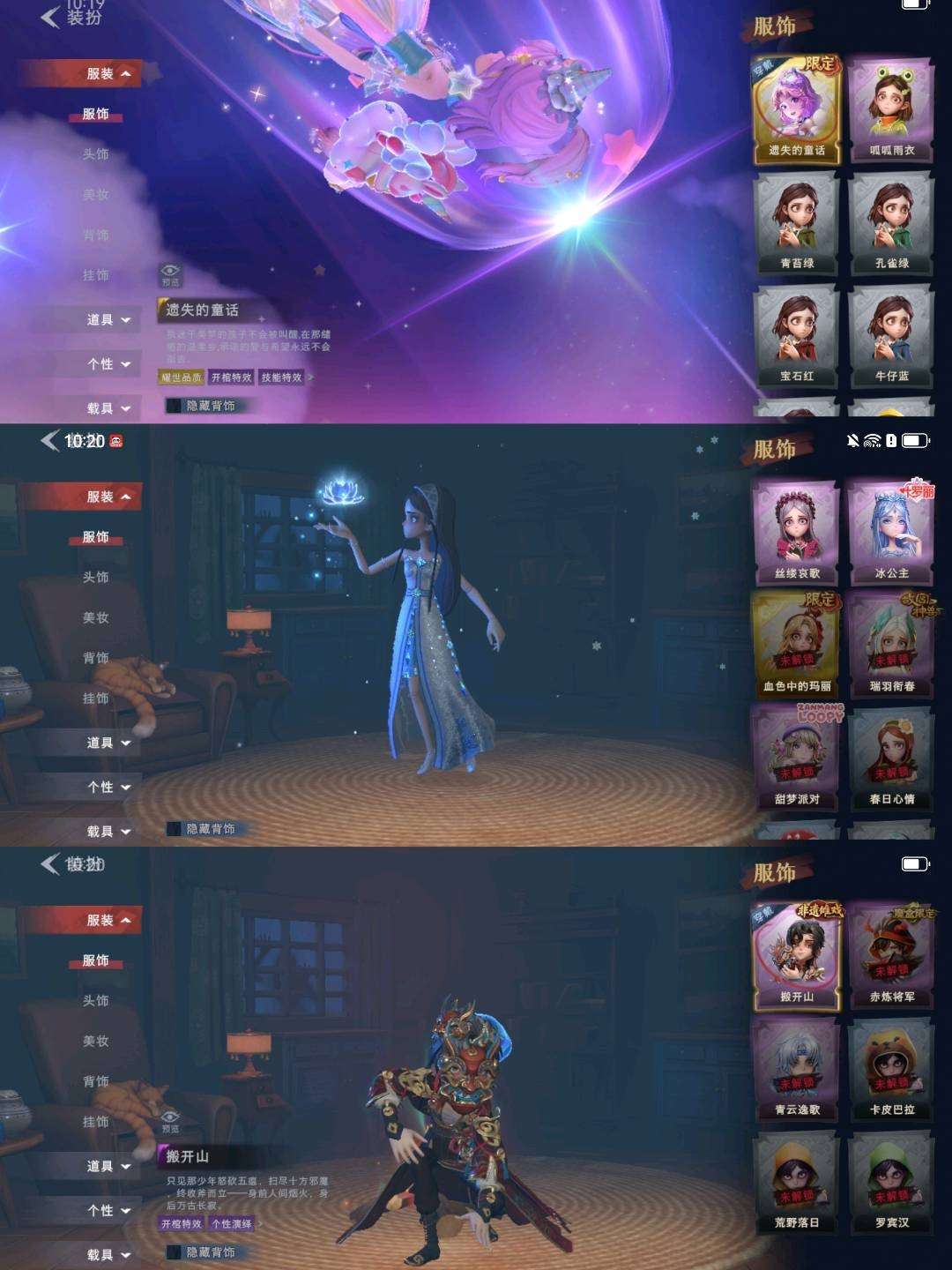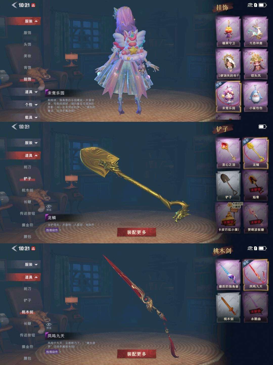 装备描述:【幻梦皮肤】巫铃儿-镜生遗梦 【金色皮肤】逍遥-莲华渡、薇薇安-圣光之谕、小黄-遗失的童话、巫铃儿-镜花辞 【紫色皮肤】零-搬开山、莉莉-莓果陷阱、莉莉-情公主、爱丽丝-冰公主、爱丽丝-丝缕哀歌、小黄-呱呱雨衣 【道具皮肤】摸金符-紫霄、传送按钮-昆仑镜、铲子-圣心之泪、黄牛能量饮料-青玉抱丹、桃木剑-凤鸣九天、音响-鸣沙鼓、急救包-蔷薇物语、专业手电-云端梦想计划、摸金符-祝祷词、桃木剑-最后的独角兽、除颤仪-弦外之音、铲子-龙鳞、腰包-宝剑八、额外的背包-飞花令、葫芦-伏妖塔、传送按钮-幻宠之门、电击枪-甜蜜泡泡枪、夜视仪-金丝眼镜、腰包-月下莲台、音响-happy猫、长鞭-飞天绫、转轮手枪-新星时代、背饰-潮汐小海兔、背饰-梵音莲华、背饰-云梦之星、背饰-天使的呼唤、背饰-蝶恋花 【头饰】樱桃奶油布丁、惊魂南瓜头套、鱼头怪头套、烈焰红唇头套、大葱明头套、火爆了头套、面具马头套、哈士奇头套、萨卡班甲鱼头套、嘻嘻头套、滑稽头套、呆滞头套、卑微头套、炙热烧烤、像素朋克墨镜、后室幸存者头套 【挂饰】九色祥鹿、未竟乐园、小鲨包包、天使消失的年代、钗头凤、糖果守卫