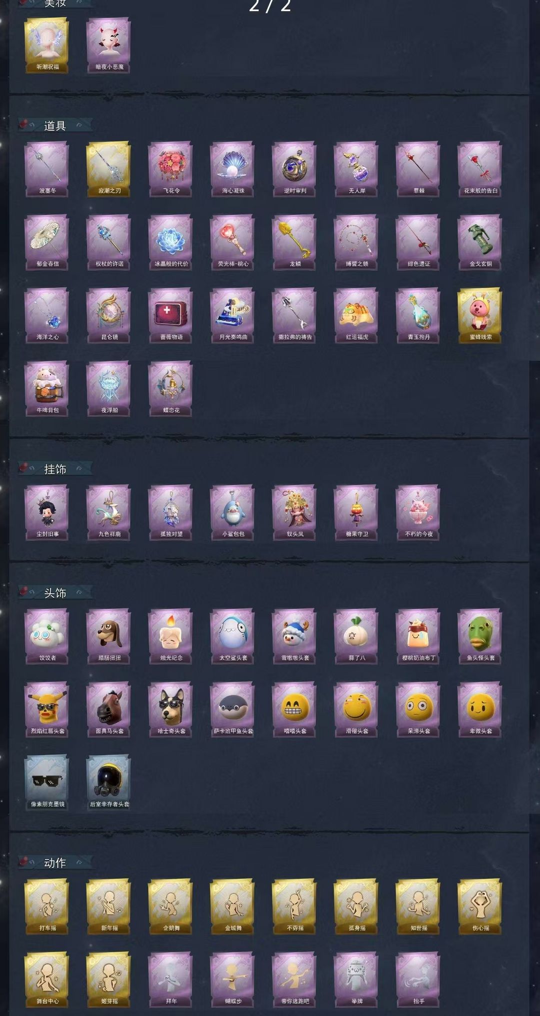 装备描述:幻梦皮肤】薇薇安-沧海之遗 【金色皮肤】逍遥-剑仙、薇薇安-海月息潮、莉莉-瑶台梦 【紫色皮肤】艾伦-黎明猎手、阿念-庆宴绮愿、爱丽丝-耀眼的你、莉莉-莓果陷阱、莉莉-除妖小师妹 【道具皮肤】长枪-波塞冬、桃木剑-寂潮之刃、额外的背包-飞花令、葫芦-海心凝珠、传送按钮-逆时审判、黄牛能量饮料-无人岸、专业手电-花束般的告白、伞-郁金春信、电击枪-权杖的许诺、除额仪-冰晶般的代价、铲子-龙鳞、长鞭-缚誓之锁、桃木剑-绯色遗证、闪光弹-金戈玄铜、摸金符-海洋之心、传送按钮-昆仑镜、急救包-蔷薇物语、音响-月光奏鸣曲、铲子-撒拉弗的祷告、腰包-红运福虎、黄牛能量饮料-青玉抱丹、背饰-蜜蜂线索、背饰-夜浮船、背饰-蝶恋花 【美妆】听潮祝福、暗夜小恶魔 【头饰】饺饺者、腊肠扭扭、纪念、太空鲨头套、雪墩墩头套、蒜了八、樱桃奶油布丁、鱼头怪头套、烈焰红唇头套、面具马头套、哈士奇头套、萨卡班甲鱼头套、嘻嘻头套、滑稽头套、呆滞头套、卑微头套、像素朋克墨镜、后室幸存者头套 【挂饰】尘封旧事、九色祥鹿、孤独对望、小鲨包包、钗头凤、糖果守卫、不朽的今夜 【动作】打车摇、新年摇、舞、金城舞、不孬摇、孤身摇、