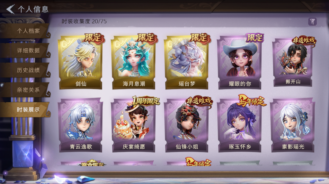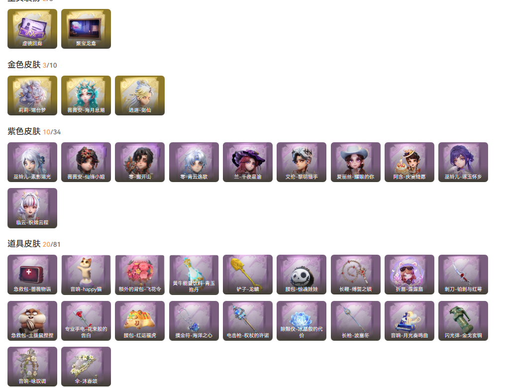 装备描述:金皮3;紫皮10;道具皮20;皮肤:逍遥-剑仙,薇薇安-海月息潮,莉莉-瑶台梦,薇薇安-仙锋小姐,巫铃儿-素影瑶光,兰-千夜星谕,零-搬开山,临云-织锦云程,巫铃儿-琢玉怀乡,零-青云逸歌,阿念-庆宴绮愿,艾伦-黎明猎手,爱丽丝-耀眼的你;道具:伞-沐春颂,闪光弹-金戈玄铜,音响-月光奏鸣曲,音响-咏叹调,腰包-红运福虎,长鞭-缚誓之锁,刺刀-铂刺与红萼,额外的背包-飞花令,急救包-蔷薇物语,腰包-惊魂娃娃,音响-happy猫,折扇-露露扇,专业手电-花束般的告白,黄牛能量饮料-青玉抱丹,电击枪-权杖的许诺,长枪-波塞冬,急救包-土拨鼠捏捏,除颤仪-冰晶般的代价,摸金符-海洋之心,铲子-龙鳞;美妆:美妆-听潮祝福,美妆-萌兔气泡;饰品:头饰-哈士奇头套,头饰-腊肠扭扭,头饰-鱼头怪头套,头饰-滑稽头套,头饰-呆滞头套,头饰-太空鲨头套,头饰-芝麻糊汤圆,头饰-蒜了八,头饰-马上有钱,头饰-萨卡班甲鱼头套,头饰-饺饺者头套,头饰-纪念,头饰-卑微头套,头饰-面具马头套,头饰-嘻嘻头套,头饰-烈焰红唇头套,头饰-像素朋克墨镜,头饰-后室幸存者头套,挂饰-九色祥鹿,挂饰-拂云仙,挂饰-桂