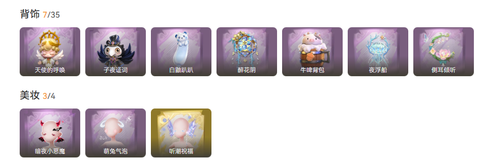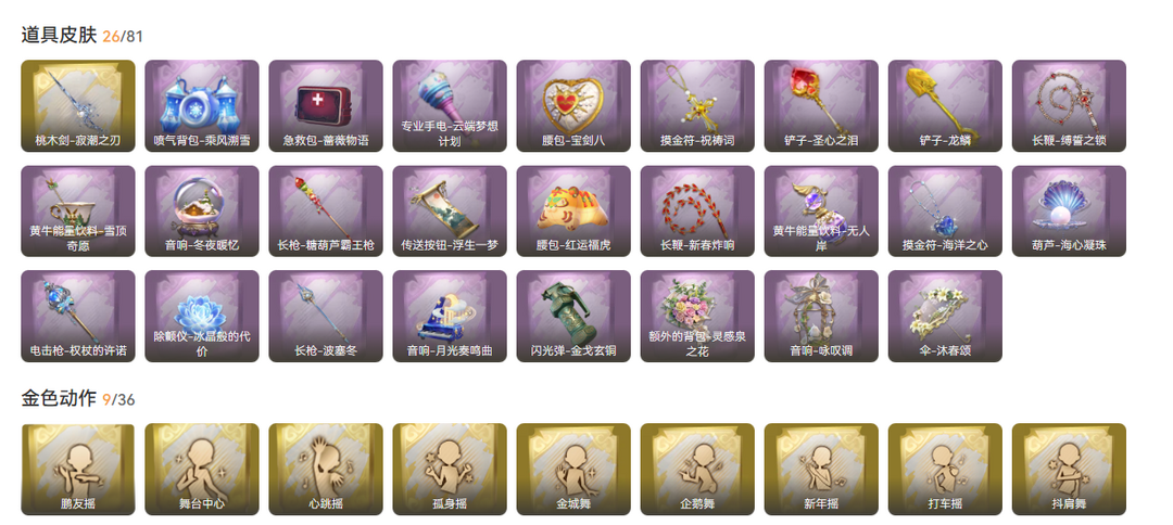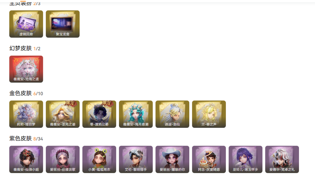 装备描述:红皮1;金皮6;紫皮8;道具皮26;皮肤:薇薇安-沧海之遗,莉莉-瑶台梦,零-渡鸦公爵,薇薇安-圣光之谕,薇薇安-海月息潮,兰-春之声,逍遥-剑仙,薇薇安-仙锋小姐,巫铃儿-琢玉怀乡,爱丽丝-丝缕哀歌,阿念-庆宴绮愿,艾伦-黎明猎手,爱丽丝-耀眼的你,爱德华-梵卓之礼,小黄-呱呱雨衣;道具:桃木剑-寂潮之刃,电击枪-权杖的许诺,闪光弹-金戈玄铜,葫芦-海心凝珠,急救包-蔷薇物语,铲子-龙鳞,摸金符-海洋之心,音响-咏叹调,伞-沐春颂,摸金符-祝祷词,黄牛能量饮料-雪顶奇愿,腰包-宝剑八,长鞭-新春炸响,腰包-红运福虎,音响-冬夜暖忆,喷气背包-乘风溯雪,黄牛能量饮料-无人岸,长枪-波塞冬,铲子-圣心之泪,长鞭-缚誓之锁,传送按钮-浮生一梦,额外的背包-灵感泉之花,长枪-糖葫芦霸王枪,音响-月光奏鸣曲,除颤仪-冰晶般的代价,专业手电-云端梦想计划;美妆:美妆-听潮祝福,美妆-萌兔气泡,美妆-暗夜小恶魔;饰品:头饰-芝麻糊汤圆,头饰-雪墩墩头套,头饰-呆滞头套,头饰-嘻嘻头套,头饰-火爆了头套,头饰-萨卡班甲鱼头套,头饰-饺饺者头套,头饰-鱼头怪头套,头饰-烈焰红唇头套,头饰-腊肠扭扭,头